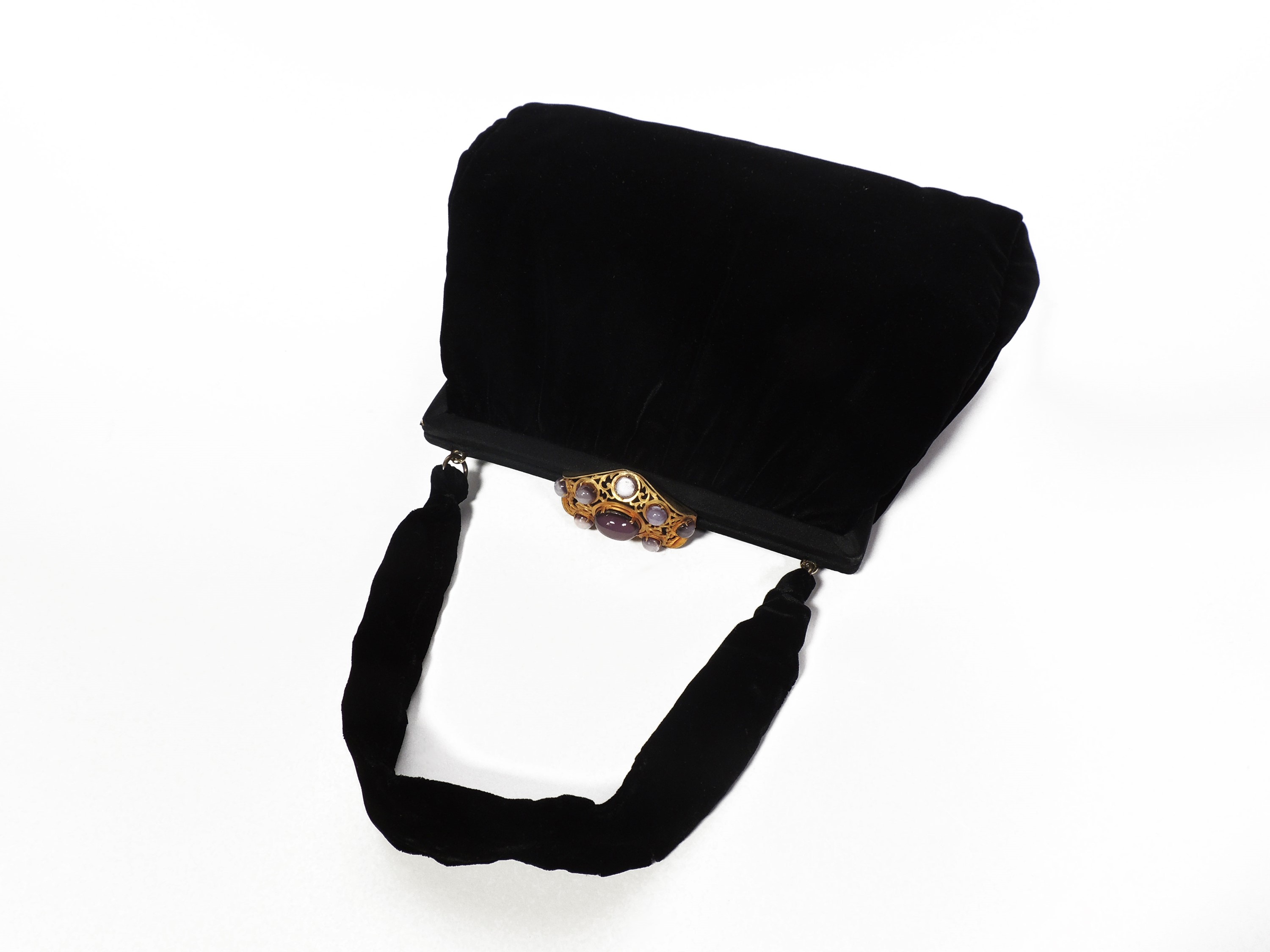 Anni Sessanta in velluto nero, chiusura in metallo dorato opaco ornata da cabochon in vetro viola, interno in seta nera e rosa con due taschini, lievi difetti