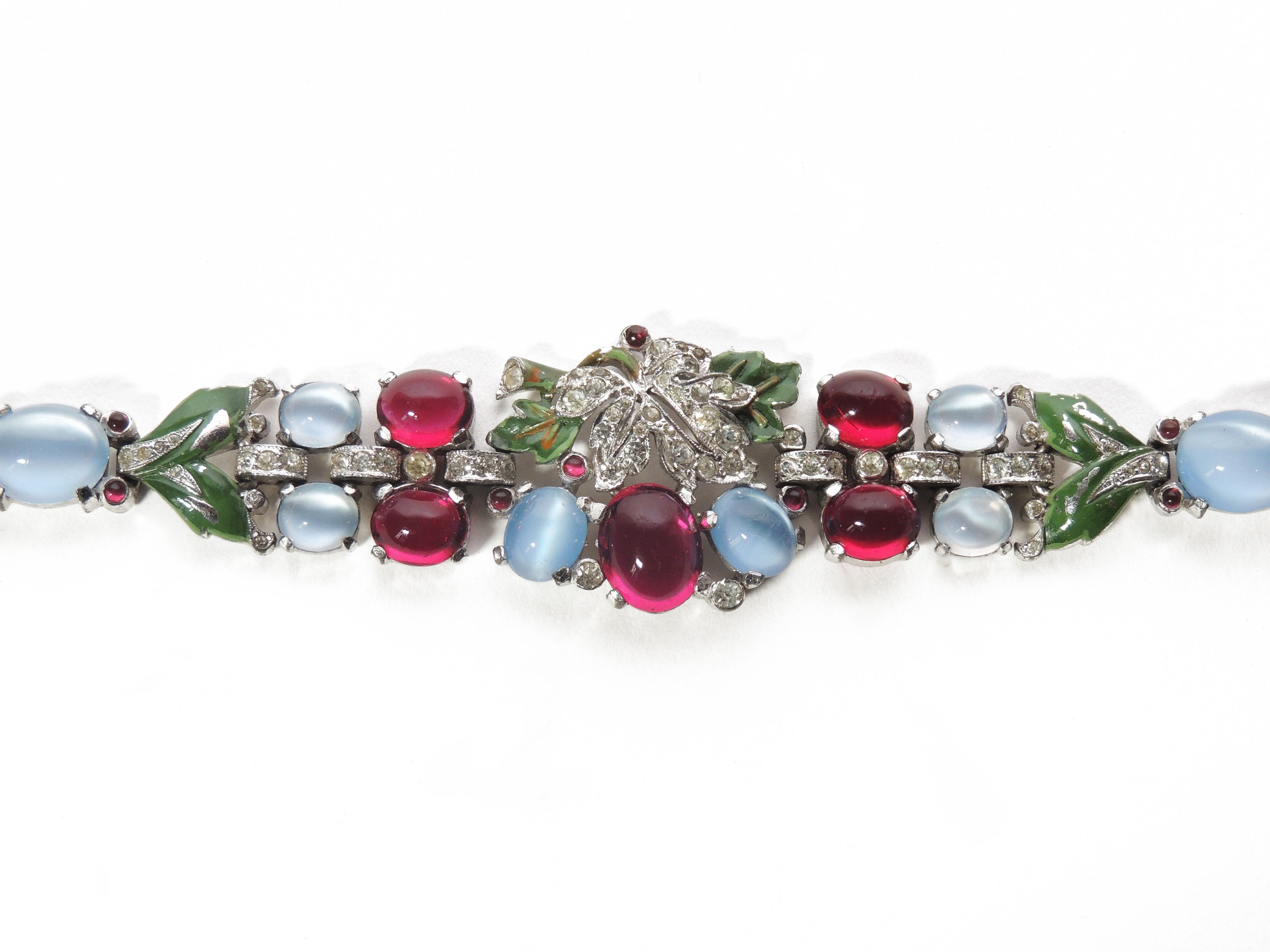 Anni Quaranta disegnato da Alfred Philippe, realizzato in metallo argentato, cabochon in lucite e vetro rosso, con foglioline smaltate di verde e strass incolore, lievi difetti