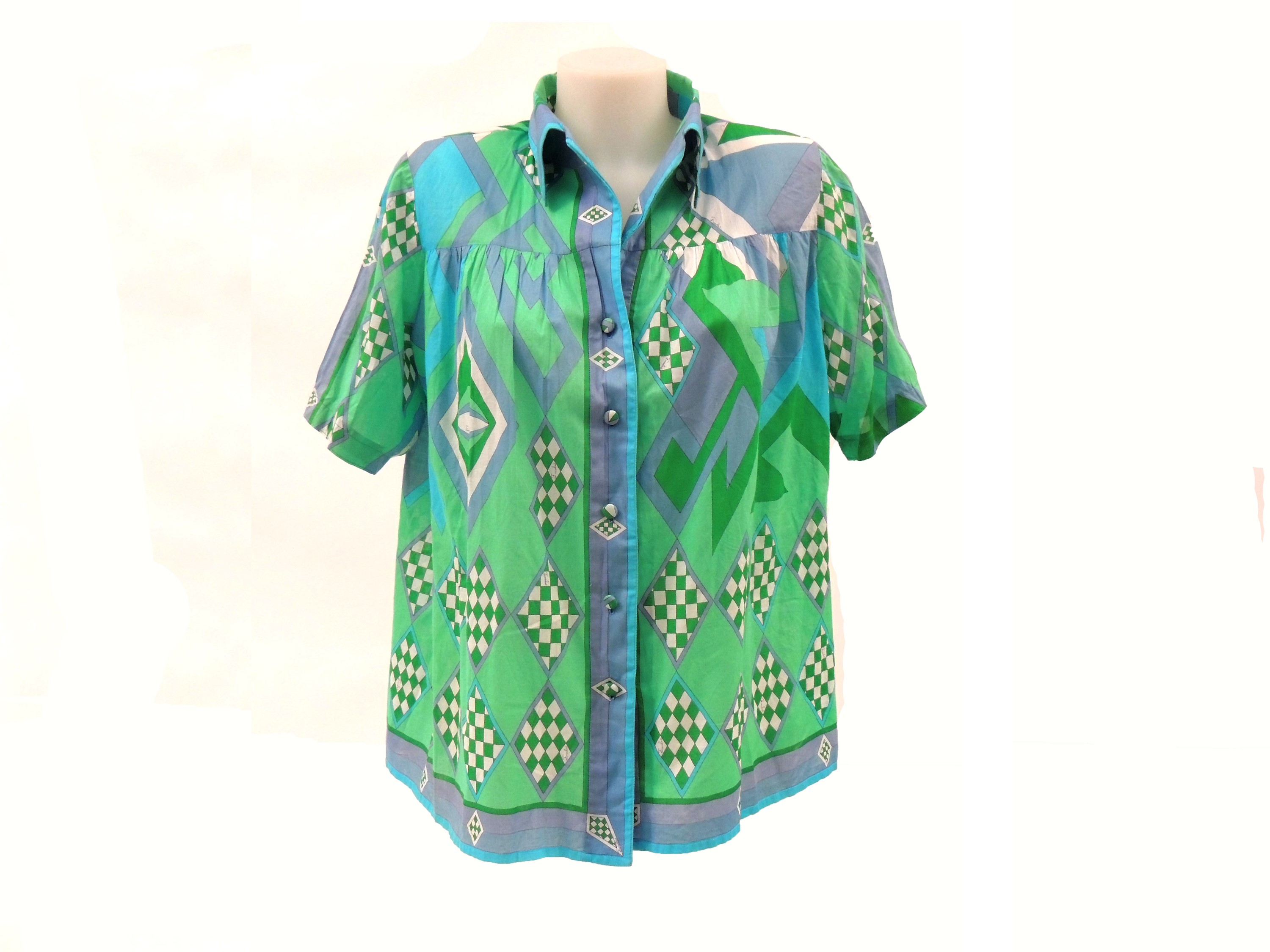 Anni Settanta in cotone con stampa fantasia geometrica nei toni del verde e azzurro