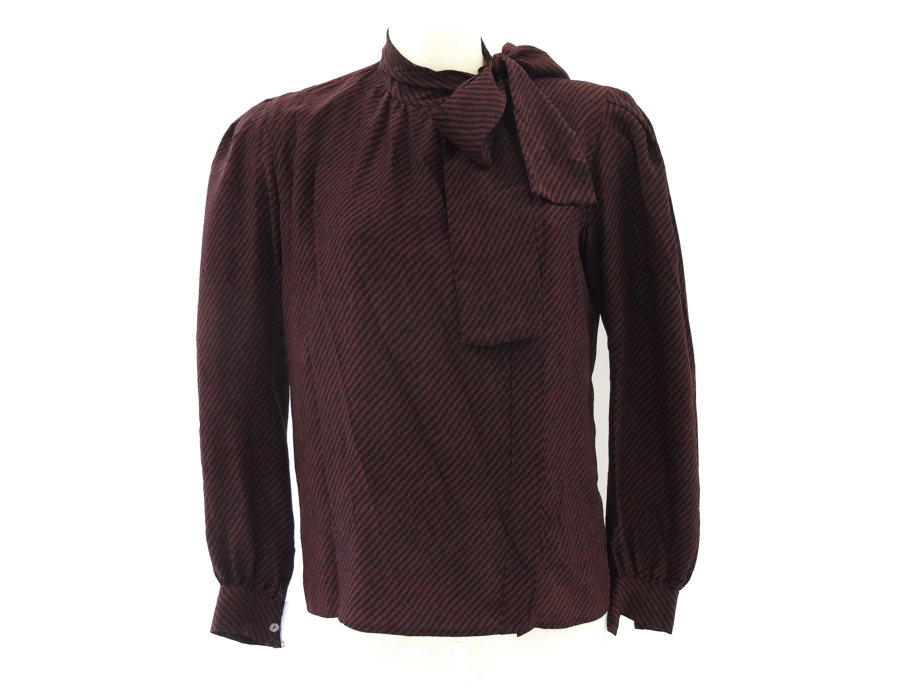 in seta bordeaux a righe nere, con collo a sciarpa, chiusura nascosta laterale, lievi difetti