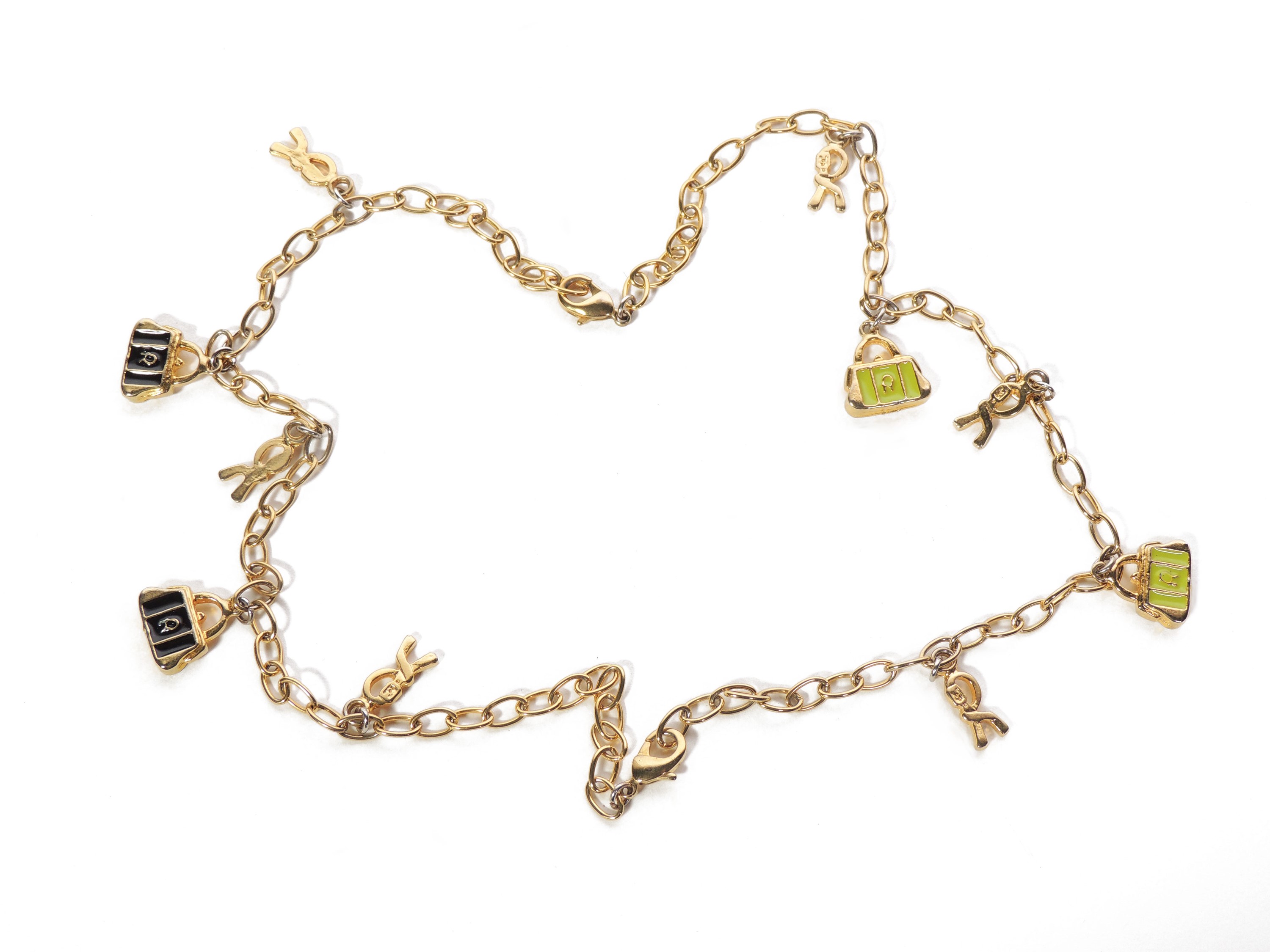 Anni Novanta due cavigliere unibili a collana in metallo dorato, charms monogram ed a borsetta smaltata verde e nera, buone condizioni