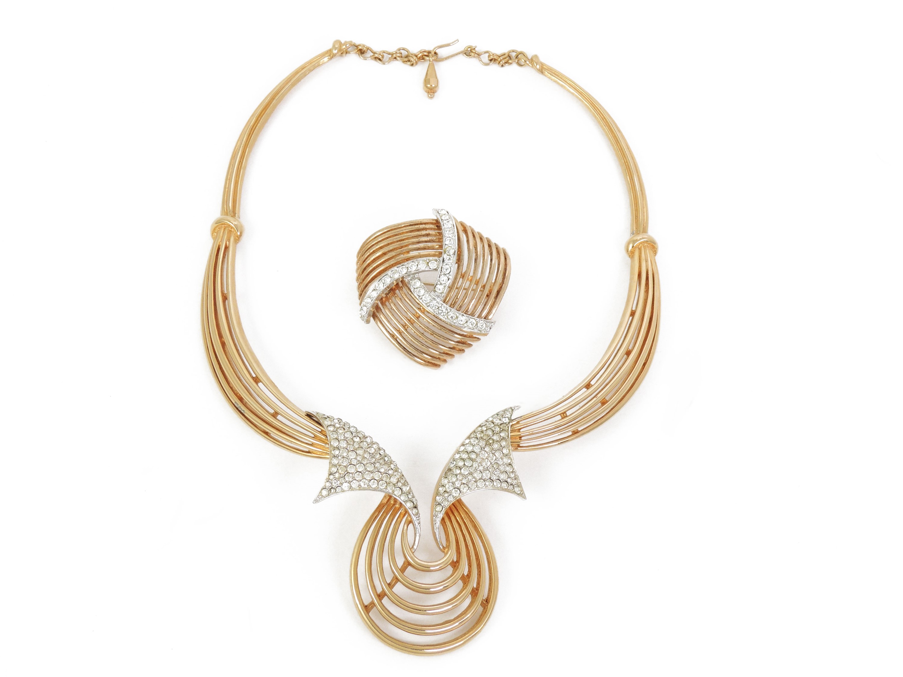 Collana e spilla in metallo dorato e strass