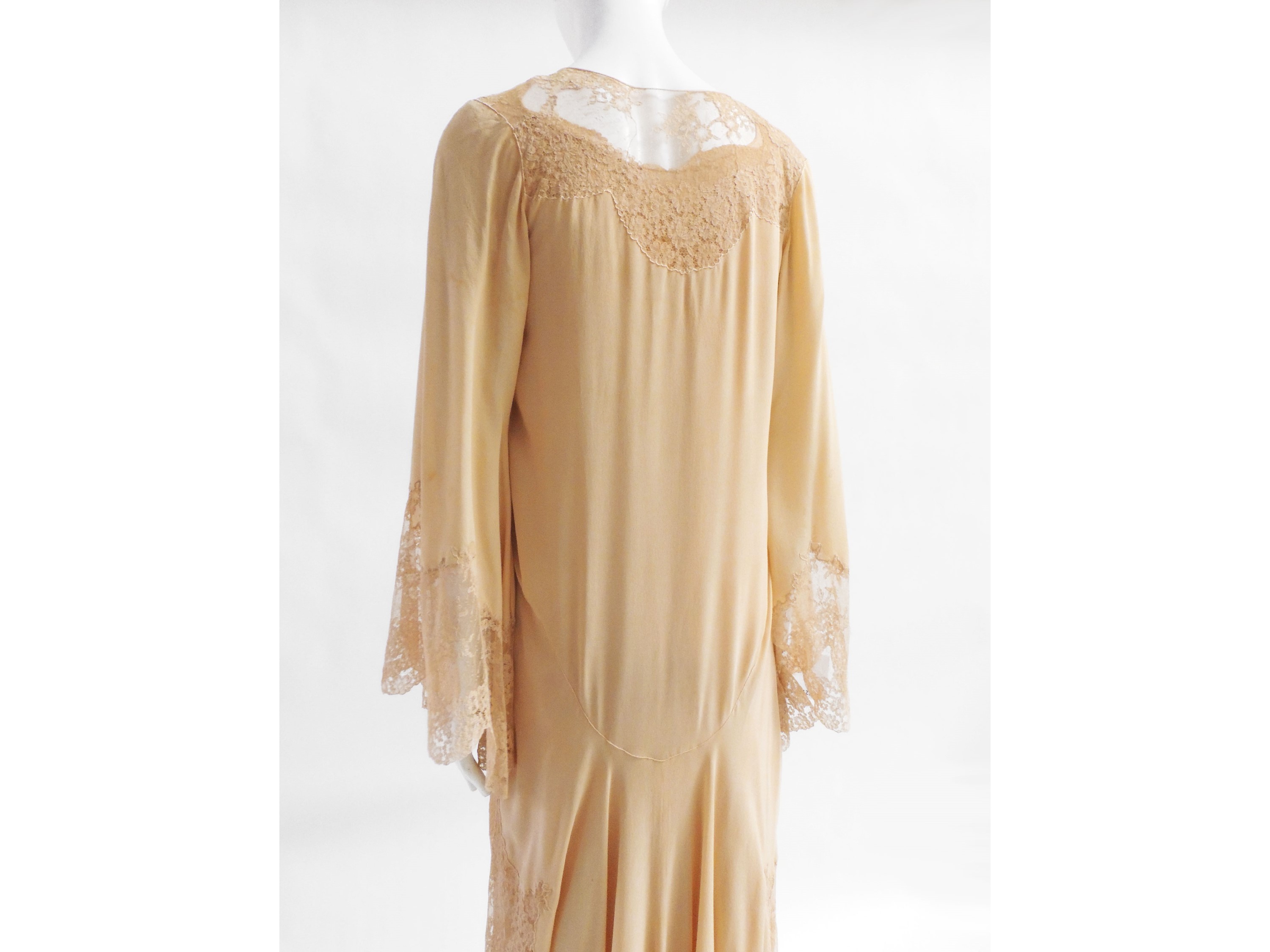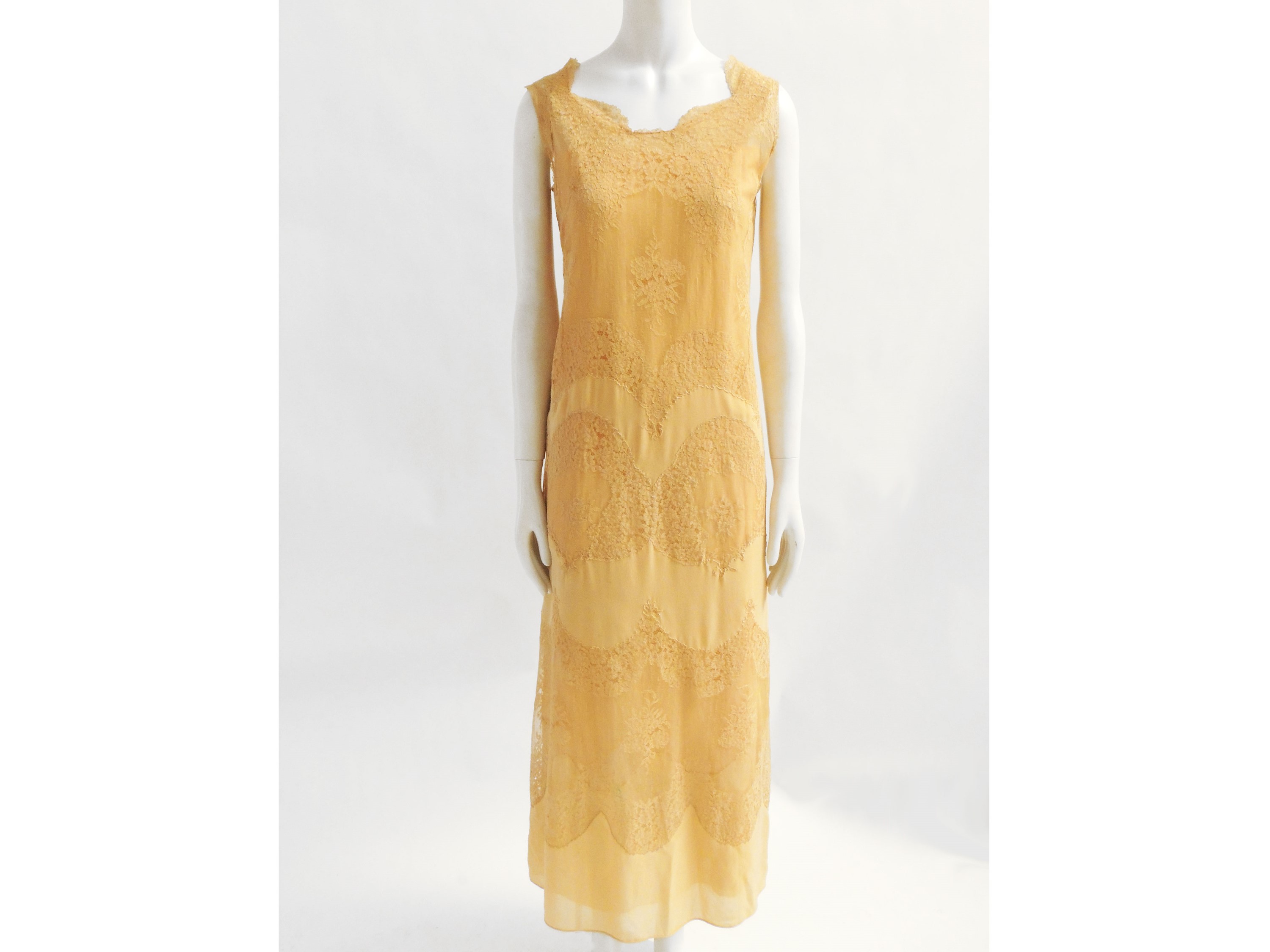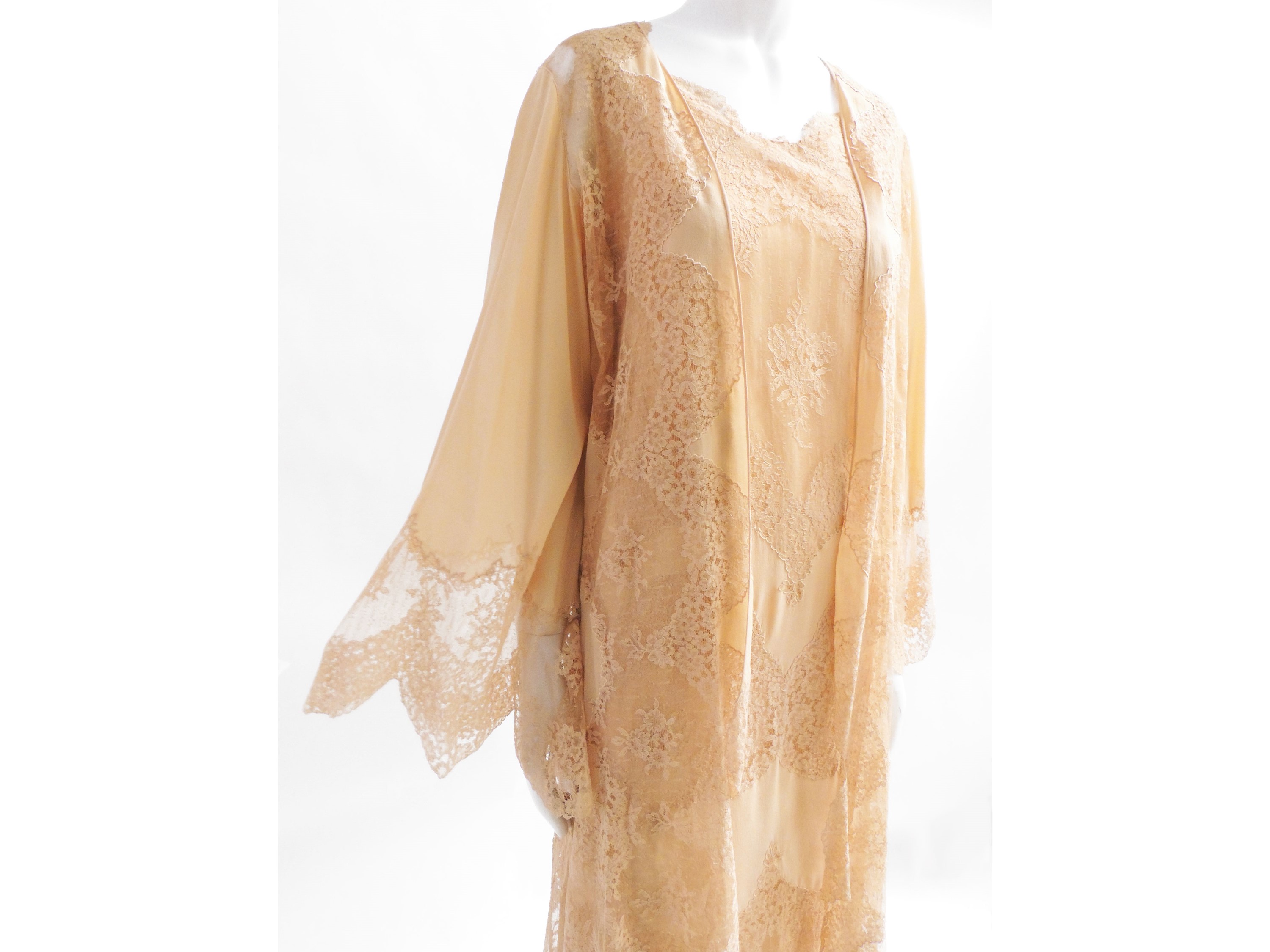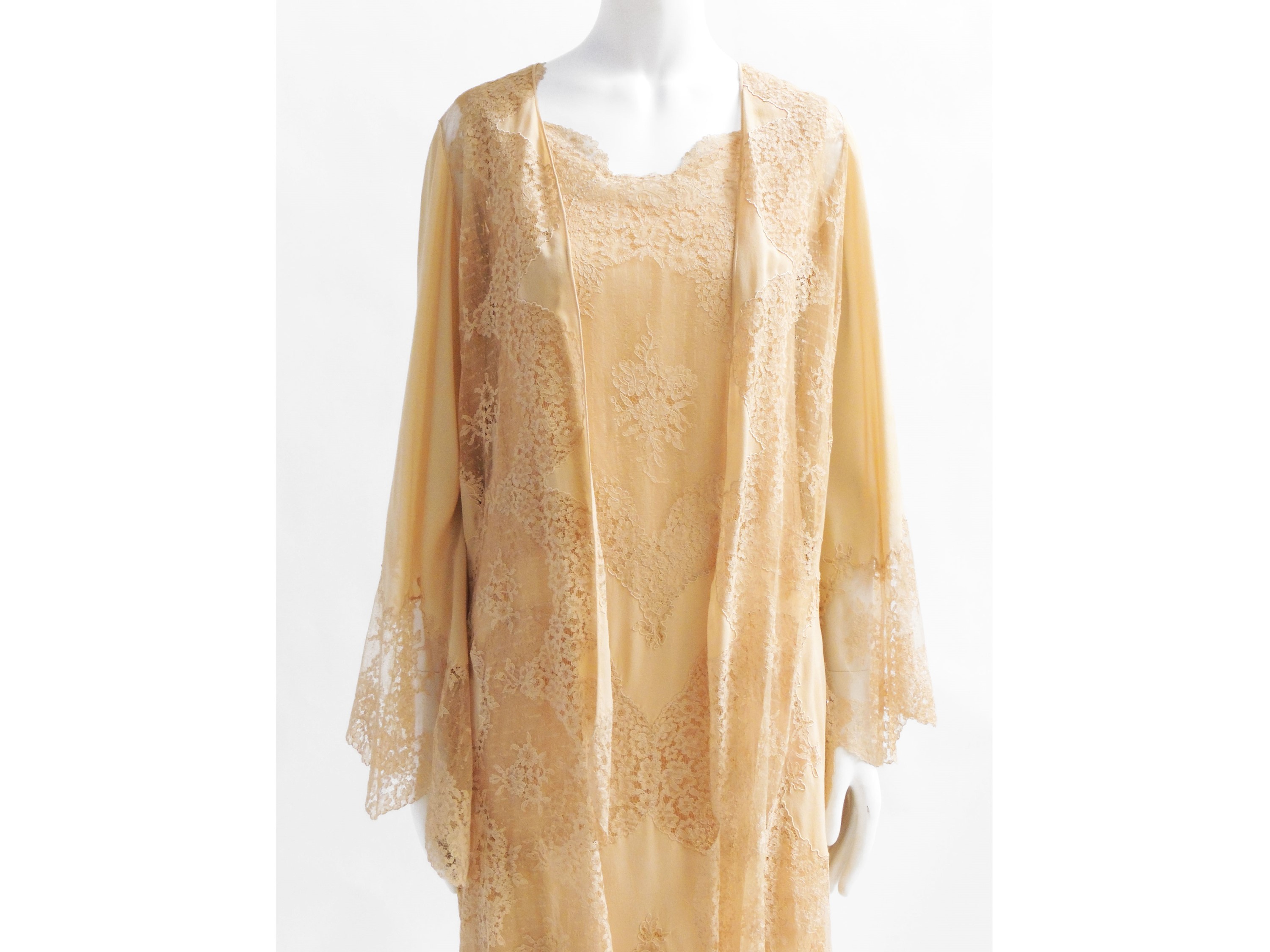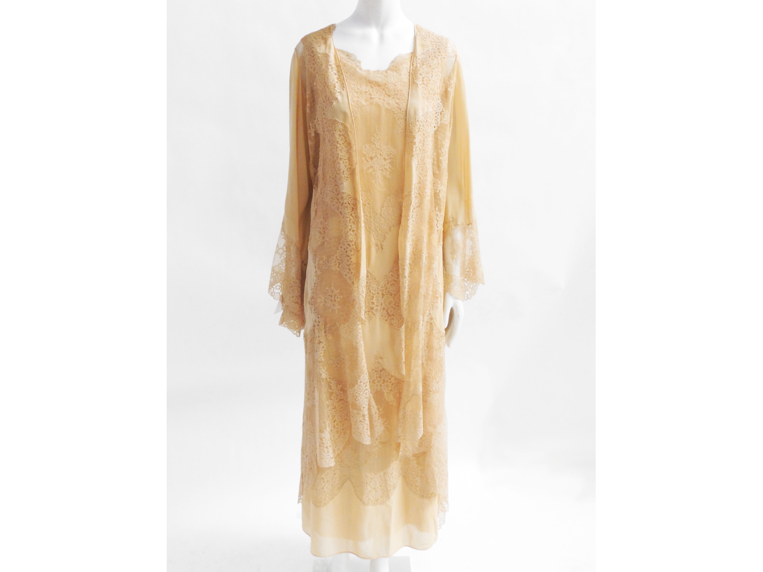 Anni Trenta composto da abito lungo e soprabito en pendant, inserti in pizzo francese, bordi del soprabito mossi, reca etichetta sulla fodera A. Molly, lievi difetti e macchie