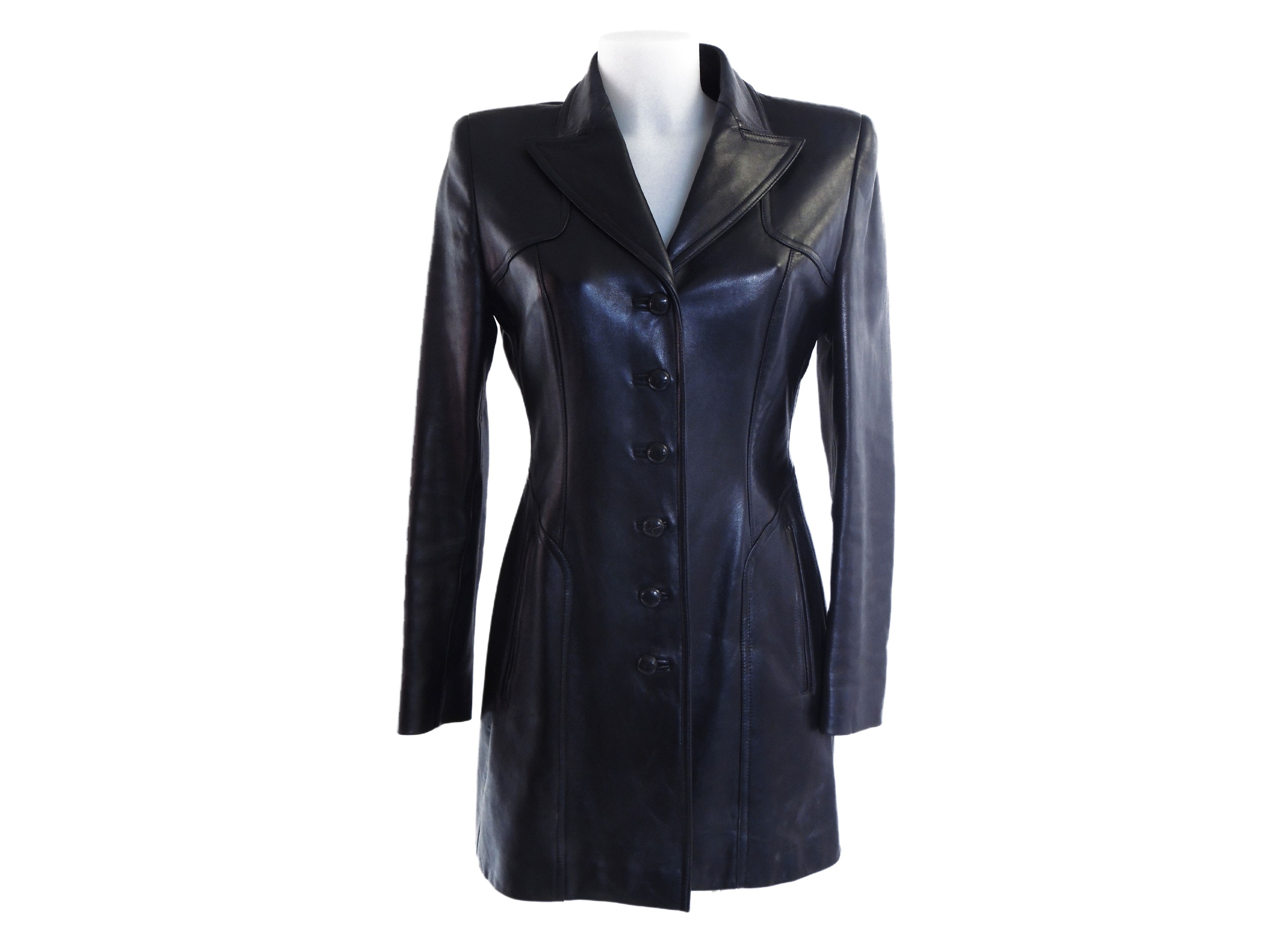 composto da soprabito, chiusura monopetto, e pantaloni in pelle nera, lievi difetti