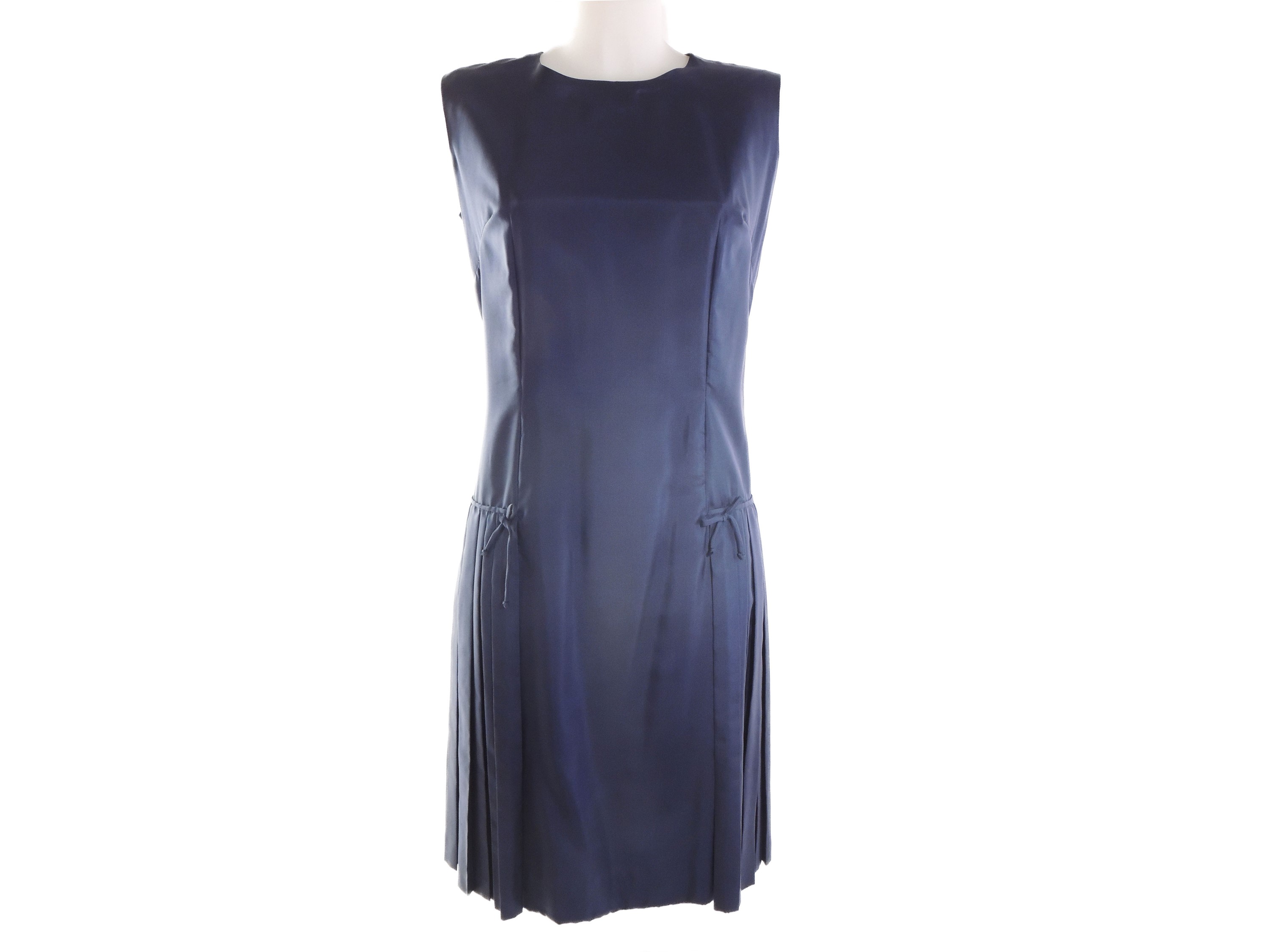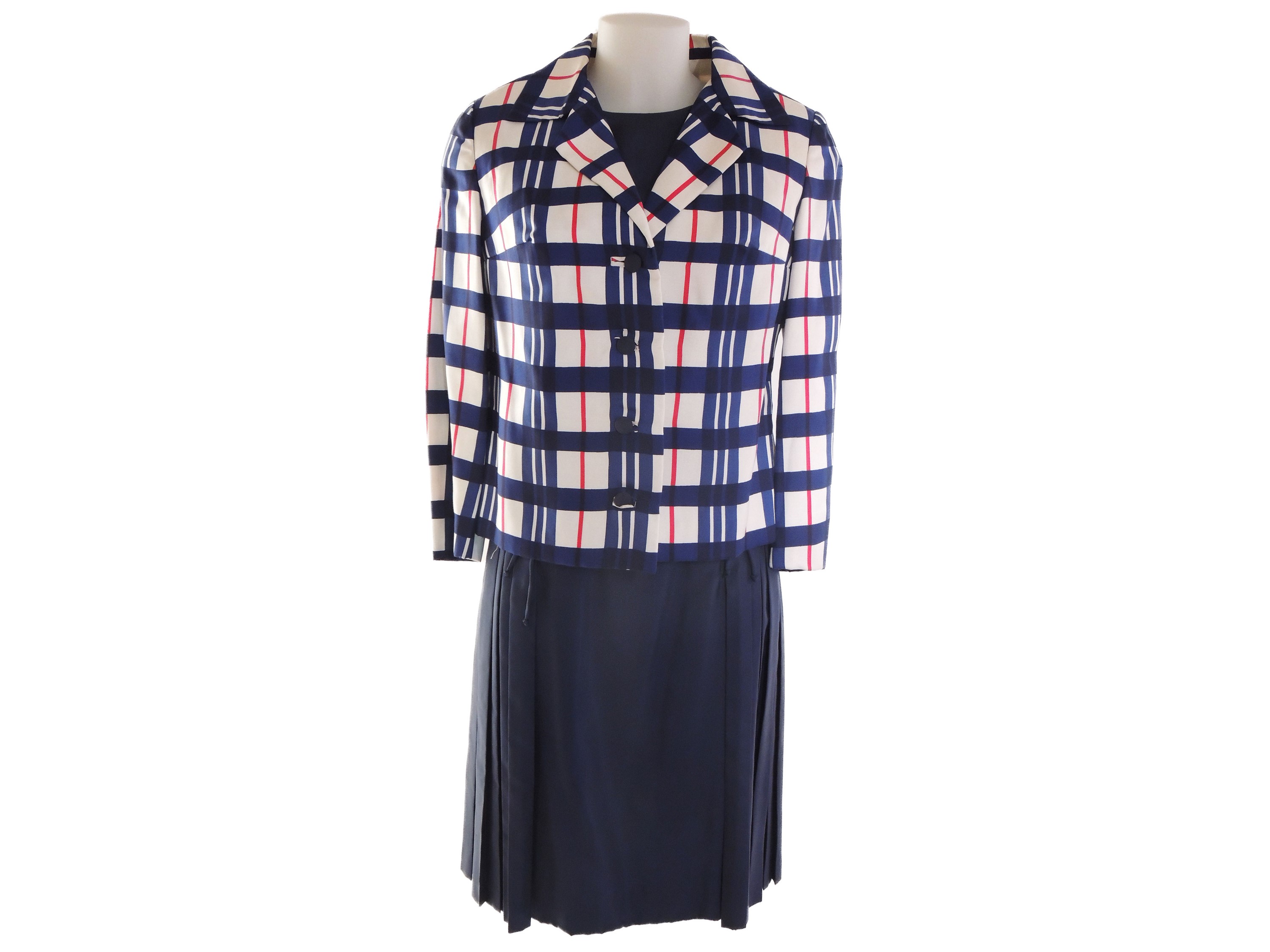 Anni Sessanta composto da giacchino in seta a quadri blu e rossi su fondo bianco, e abito in seta blu con gonna plissettata, lievi difetti