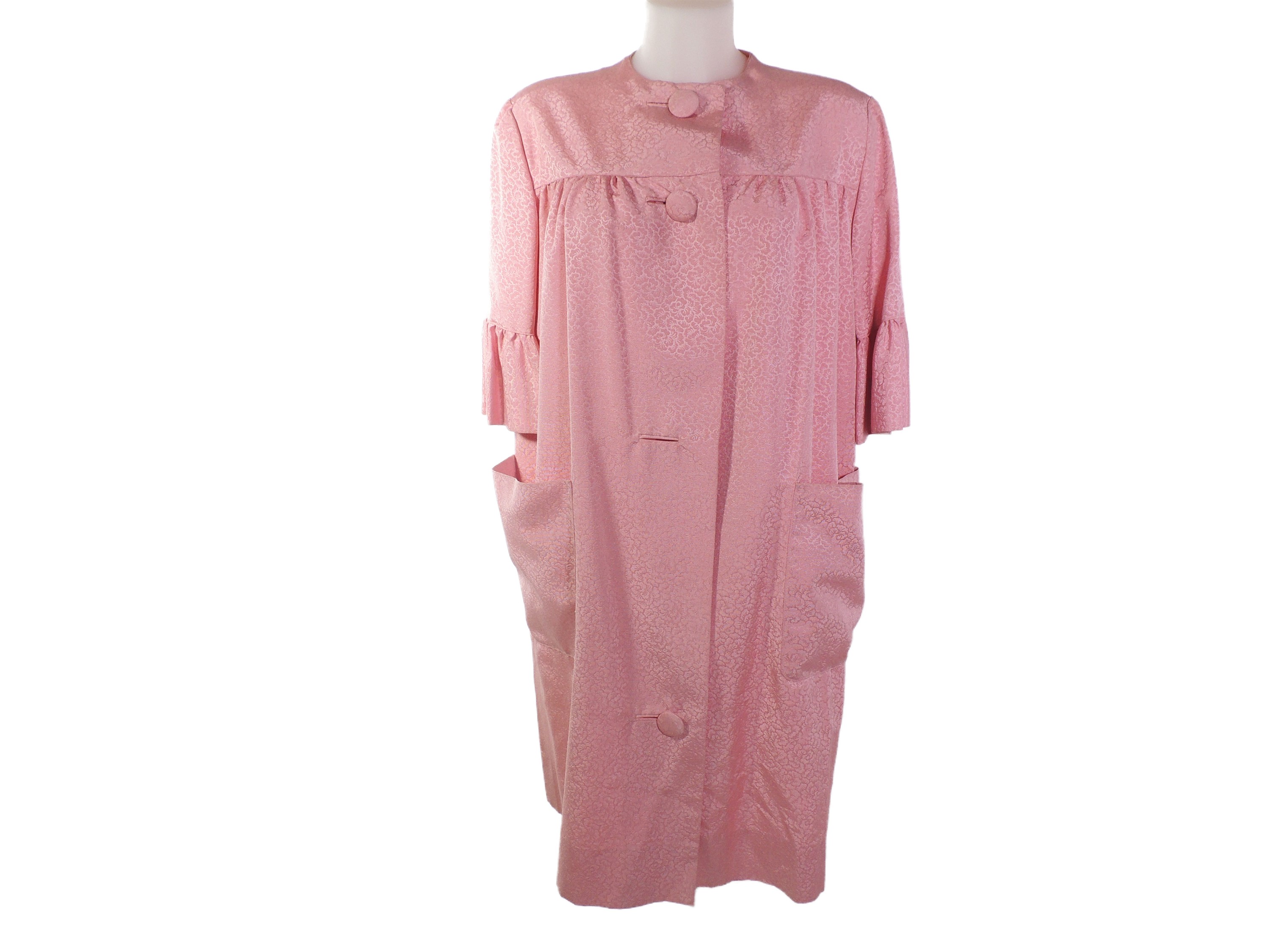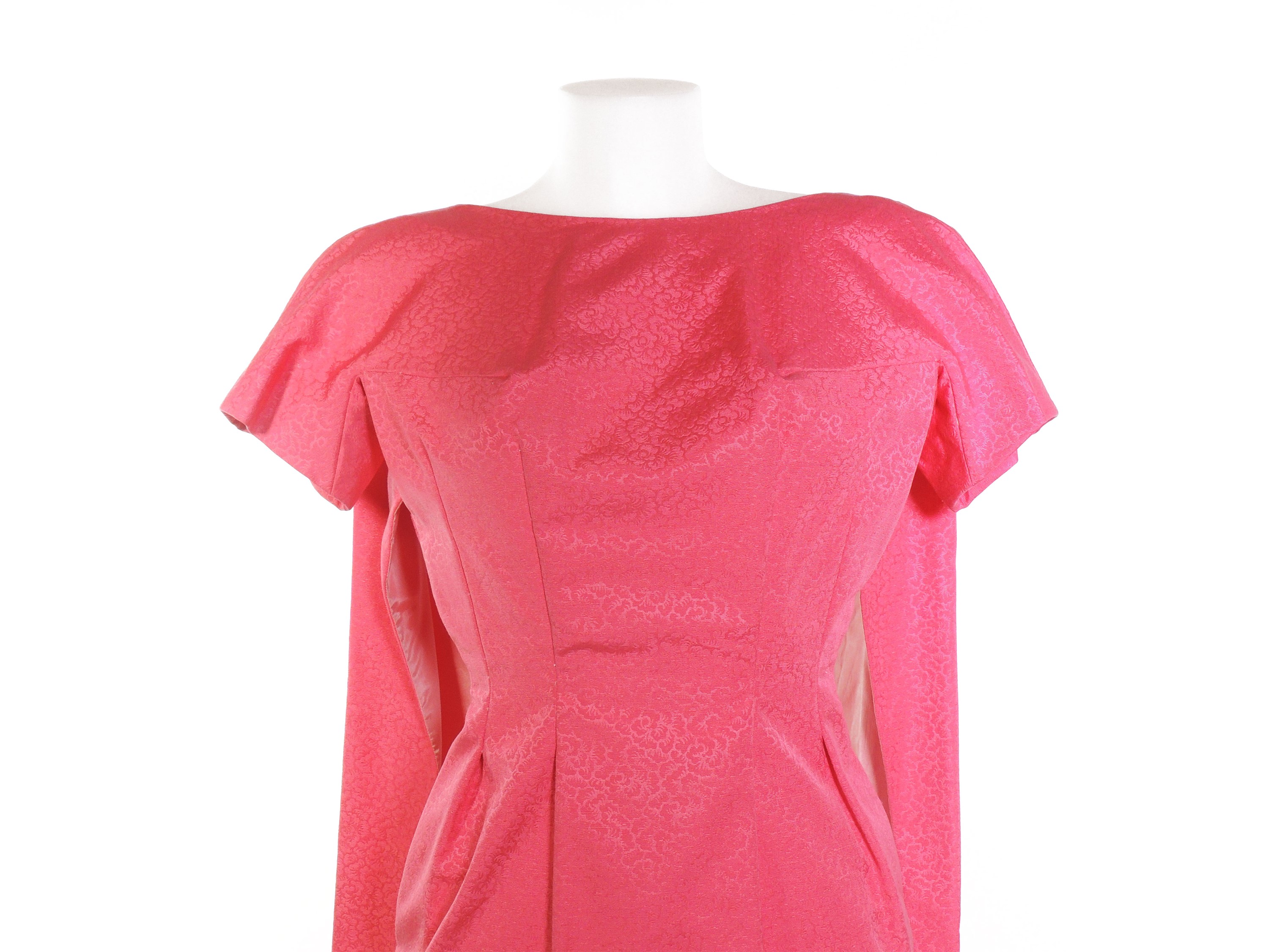 tg 42 e 44 (2) Anni Sessanta composto da abitino e soprabito in due toni di rosa, l'abito con scollo a barca e sul retro ornato da due fasce con balza, il soprabito con scollo rotondo, manica tre quarti con balza, chiusura monopettto con grandi bottoni, modello a trapezio, lievi difetti e lievi macchie