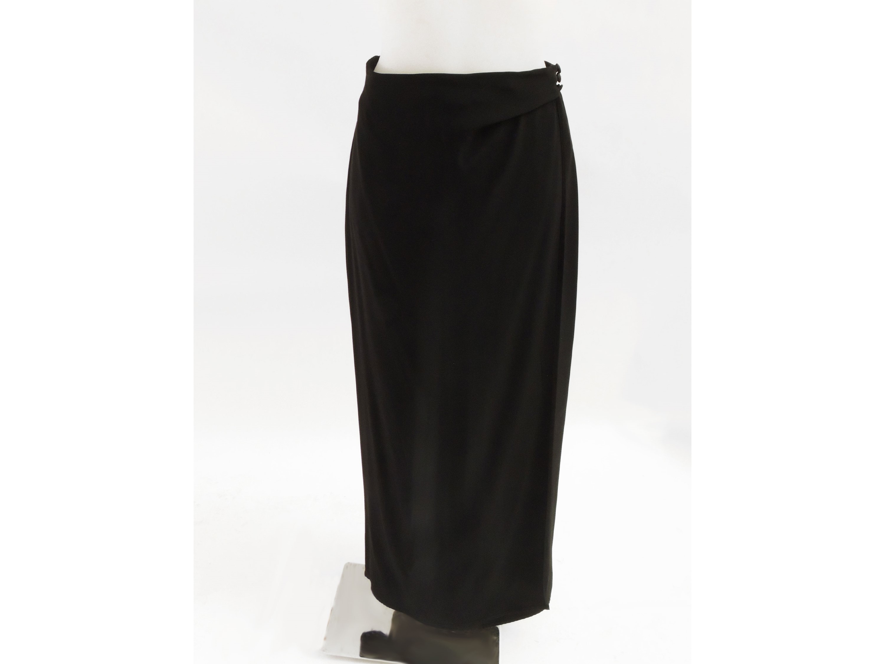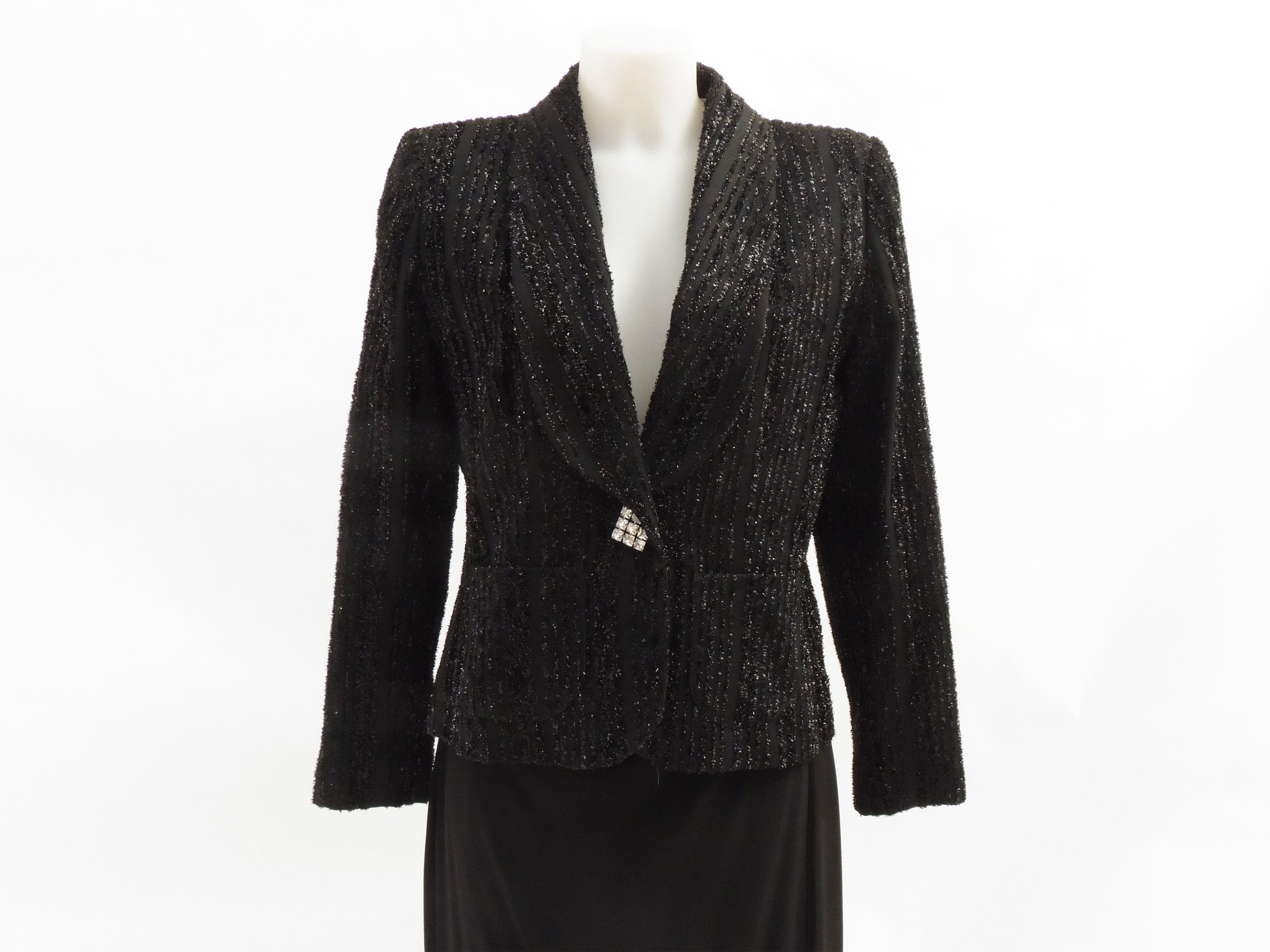 Anni Novanta composto da giacca in cotone gessato a righe di lurex nero, chiusura monopetto con bottone gioiello, e lunga gonna in viscosa con chiusura a portafoglio, lievi difetti