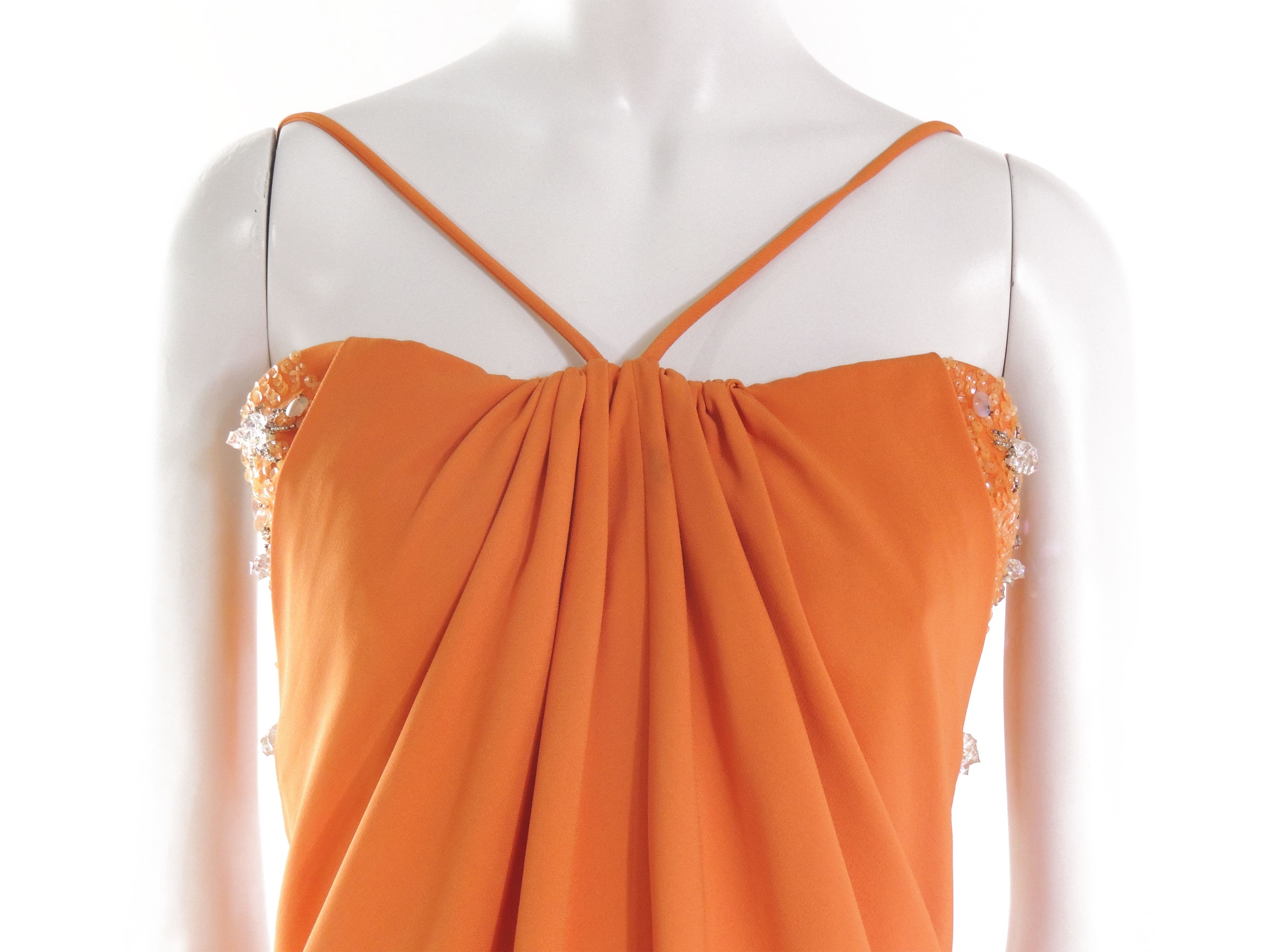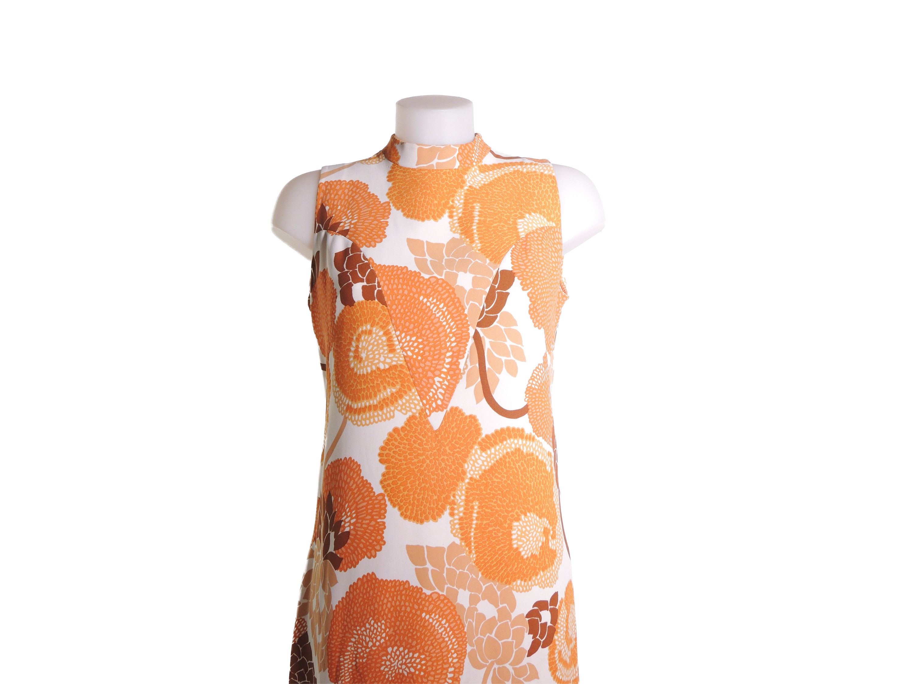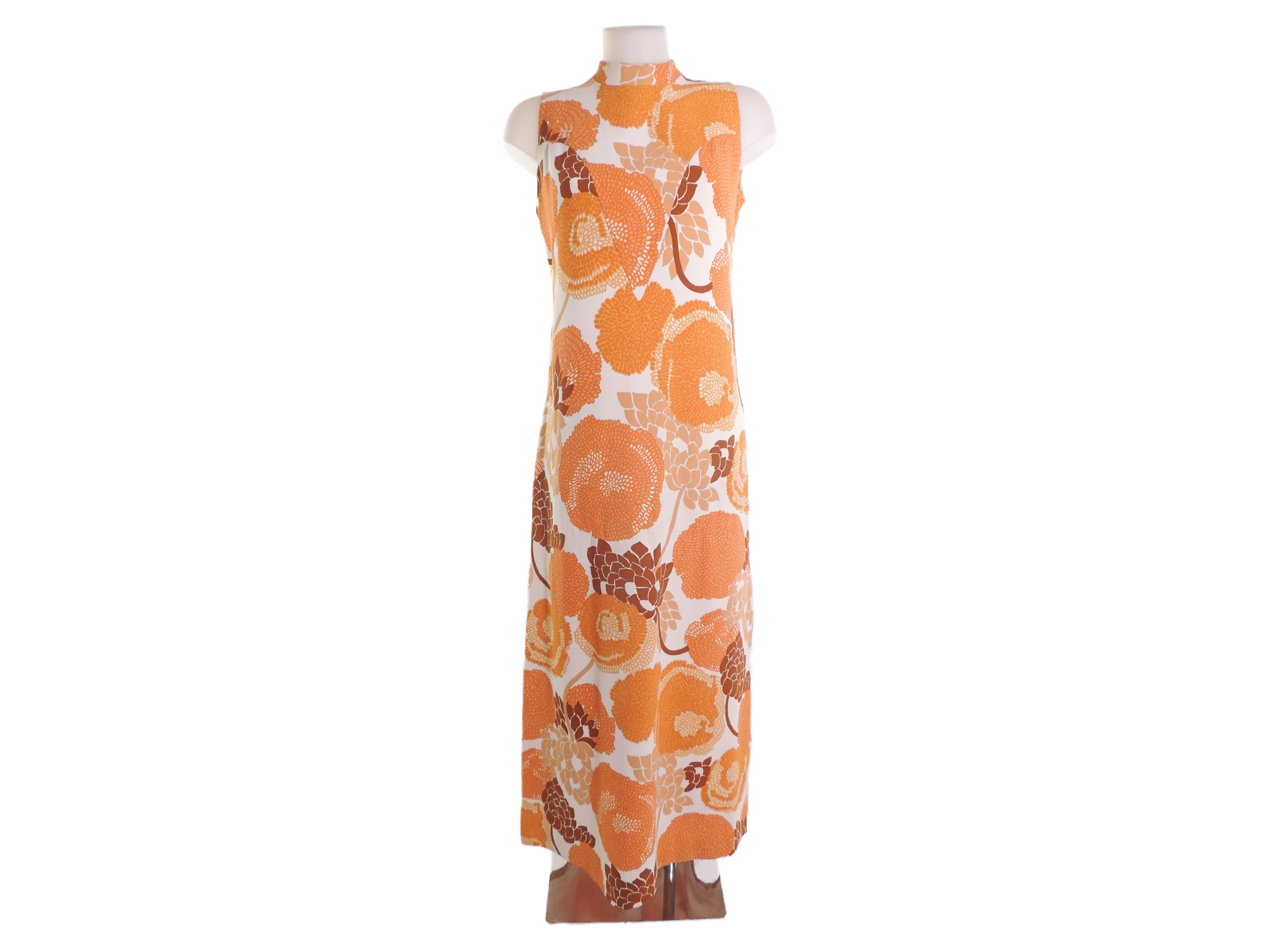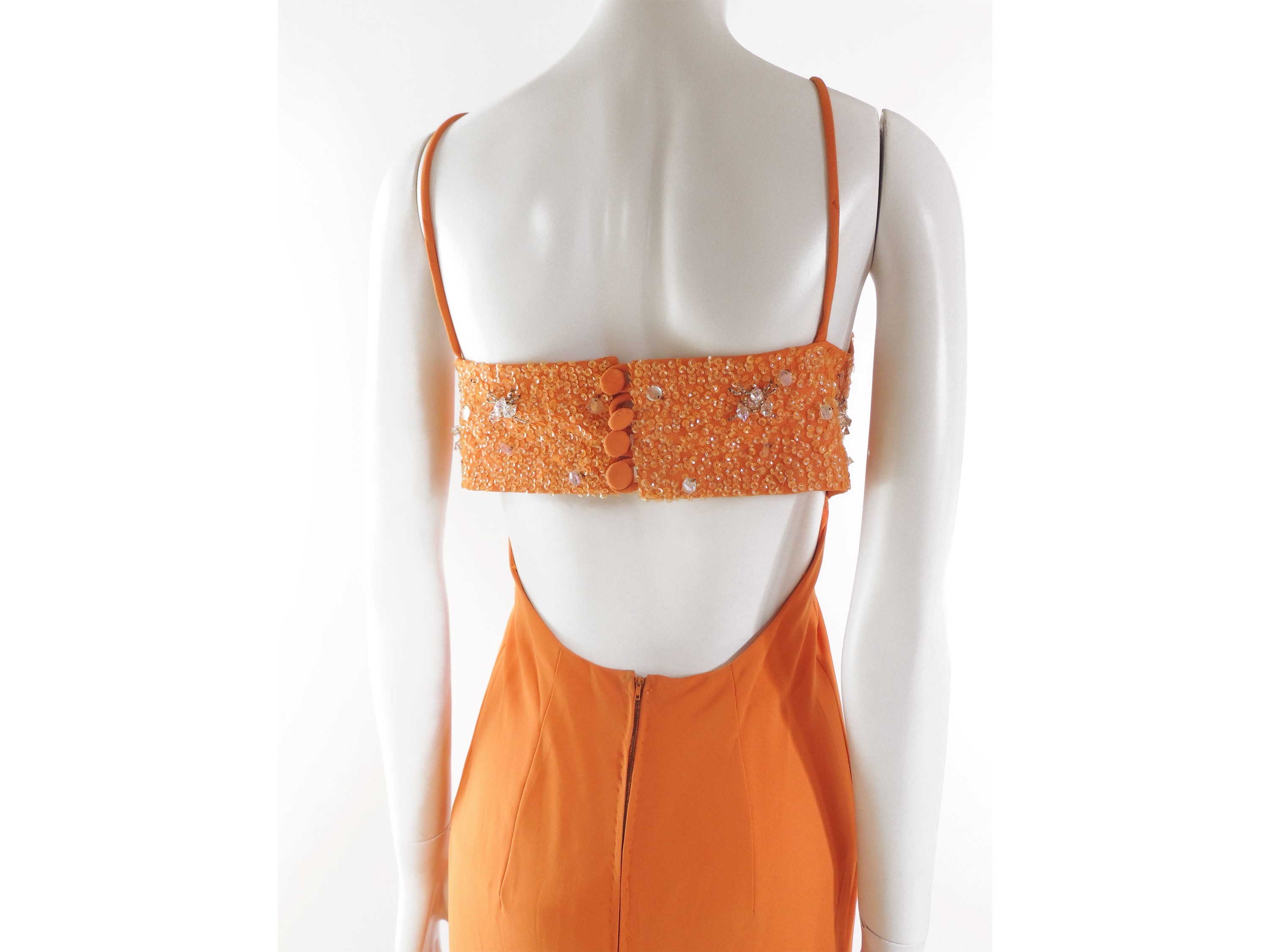 Anni Settanta uno in viscosa arancione, sottili spalline e fascia sulla schiena ornata da perline e paillettes tono su tono, l'altro in jersey a stampa floreale nei toni dell'arancione su fondo bianco, lievi difetti e macchie