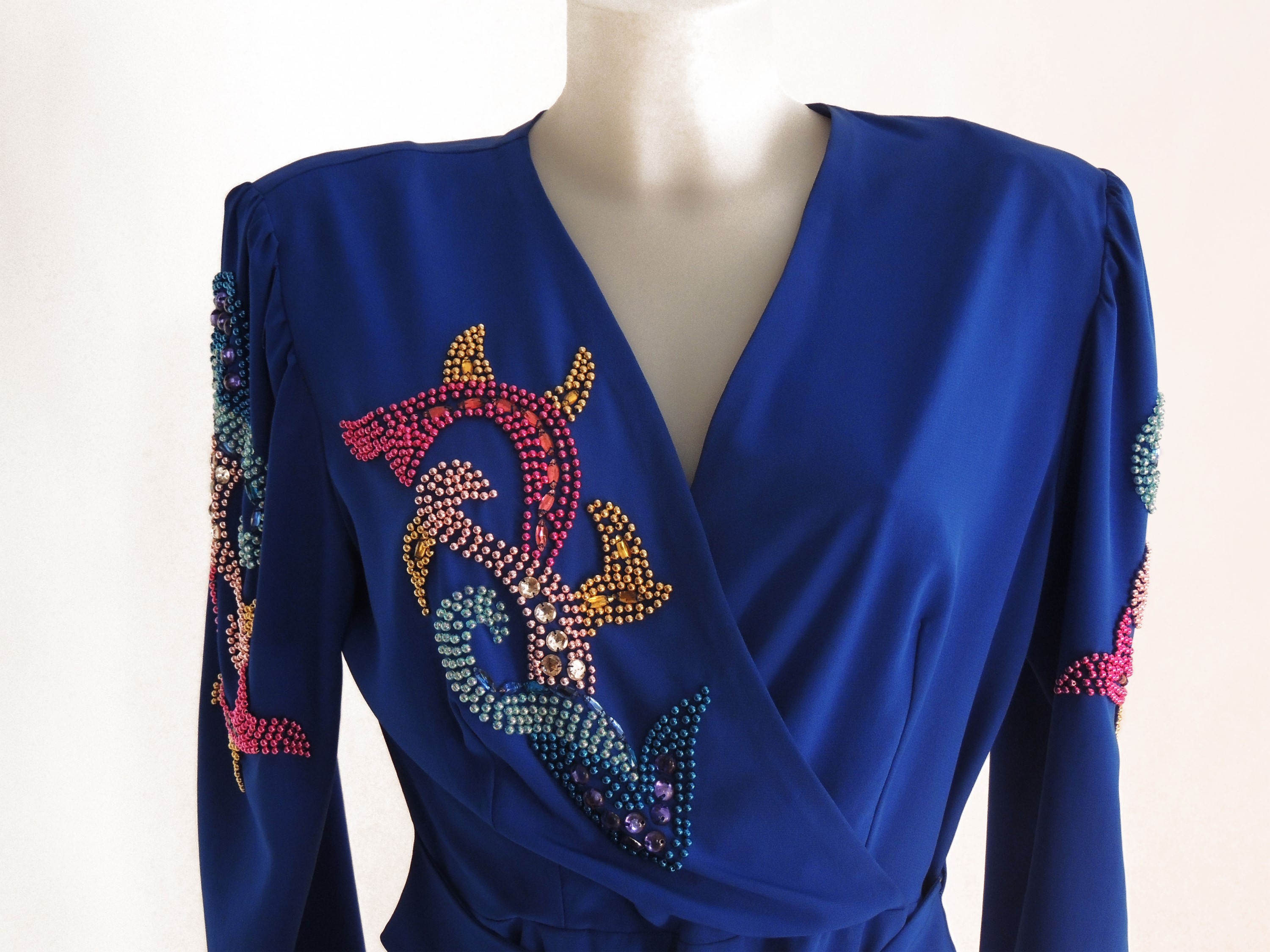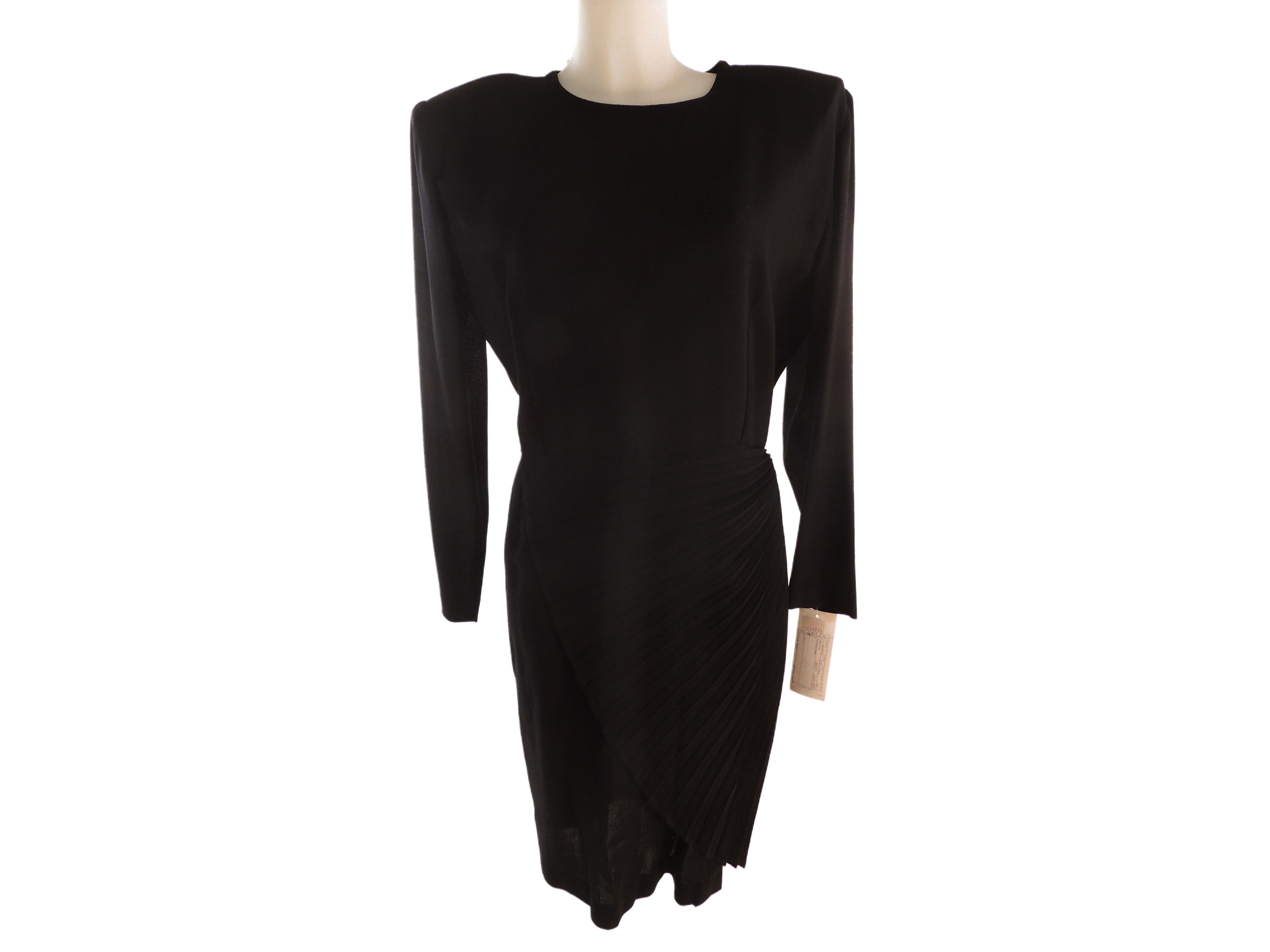 Anni Ottanta uno in viscosa blu elettrico, incrociato sul davanti e ornato da perline multicolor, l'altro in lana nera con drappeggio plissettato sulla gonna, difetti e macchie