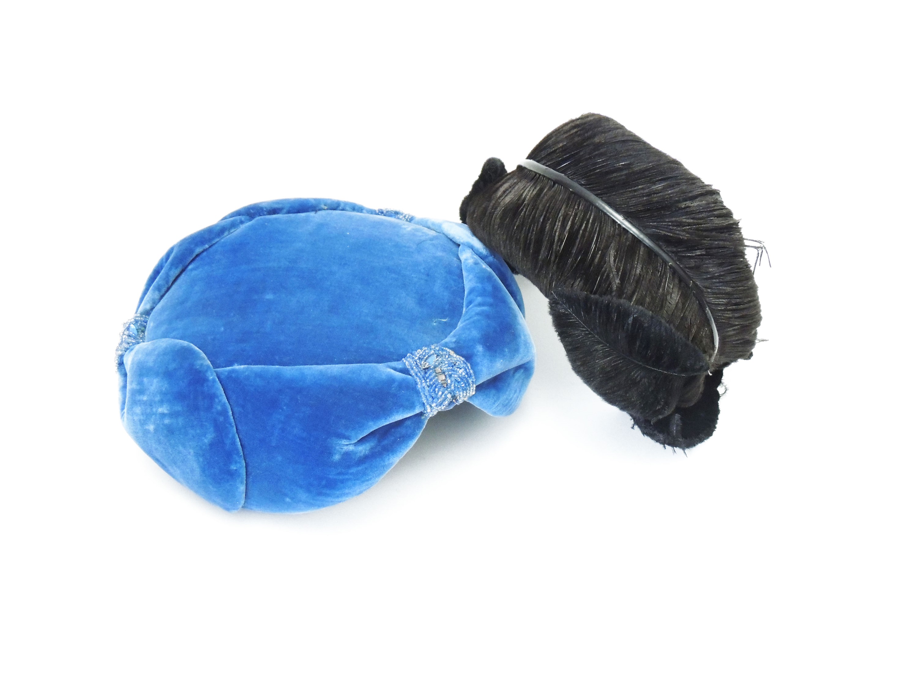 Anni Cinquanta uno in velluto azzurro, ornato da perline tono su tono, ed un ornamento per acconciatura ornato da piume di marabù nero, lievi difetti e mancanze
