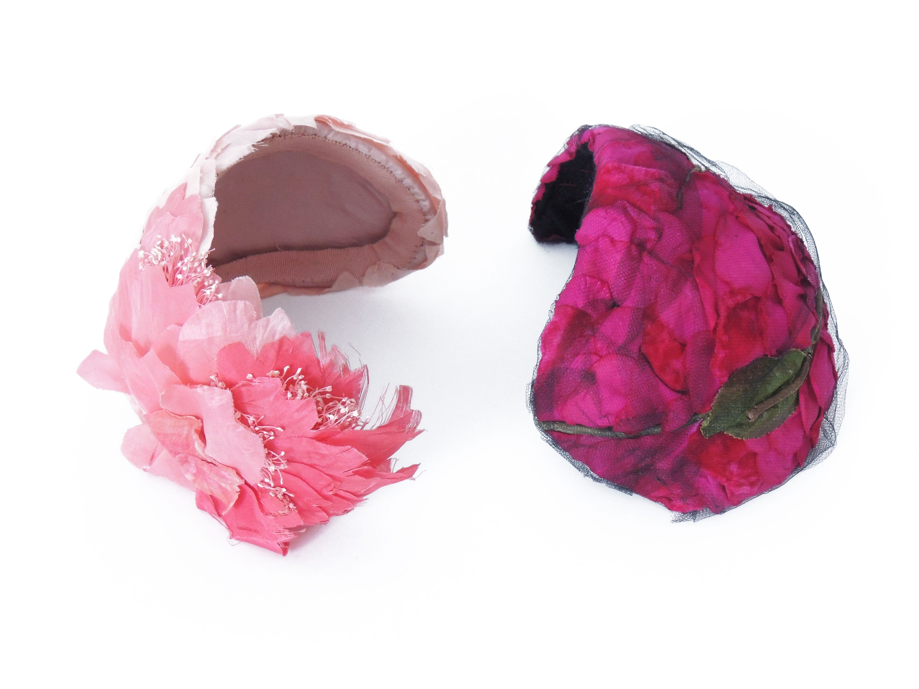 Anni Cinquanta realizzati entrambi con petali in raso e velluto fucsia e rosa, uno con velina in tulle nero, lievi difetti