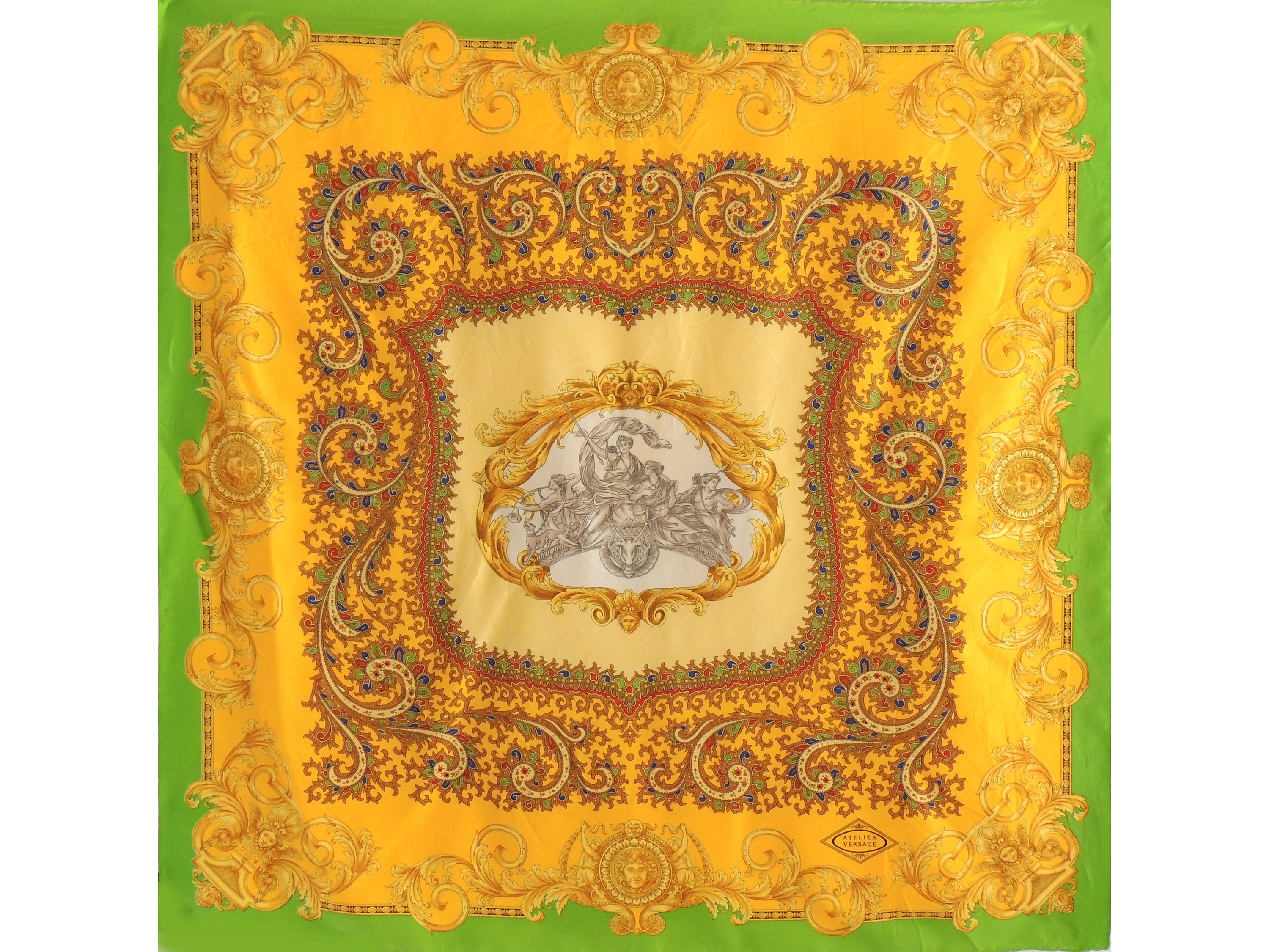 Anni Novanta in seta con stampa a girali dorati su fondo giallo e figura della dea Diana al centro, bordo verde, lievi difetti