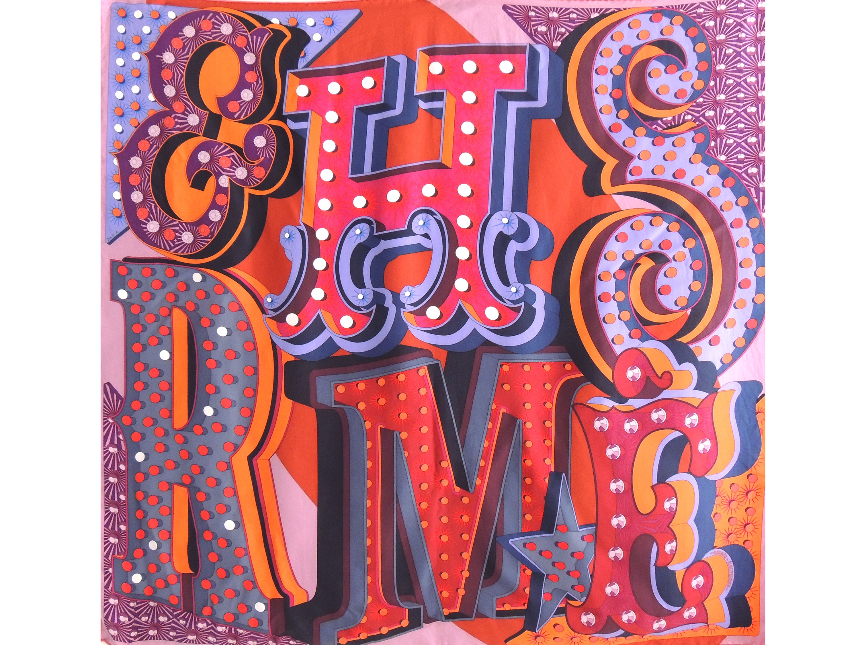 2016 in seta stampata con scritta HERMES con caratteri ad insegna luminosa nei toni del viola, arancione e fucsia, disegnata da Dimitri Rybaltchenkor (prima ed. 2015), corredato di scatola, buone condizioni