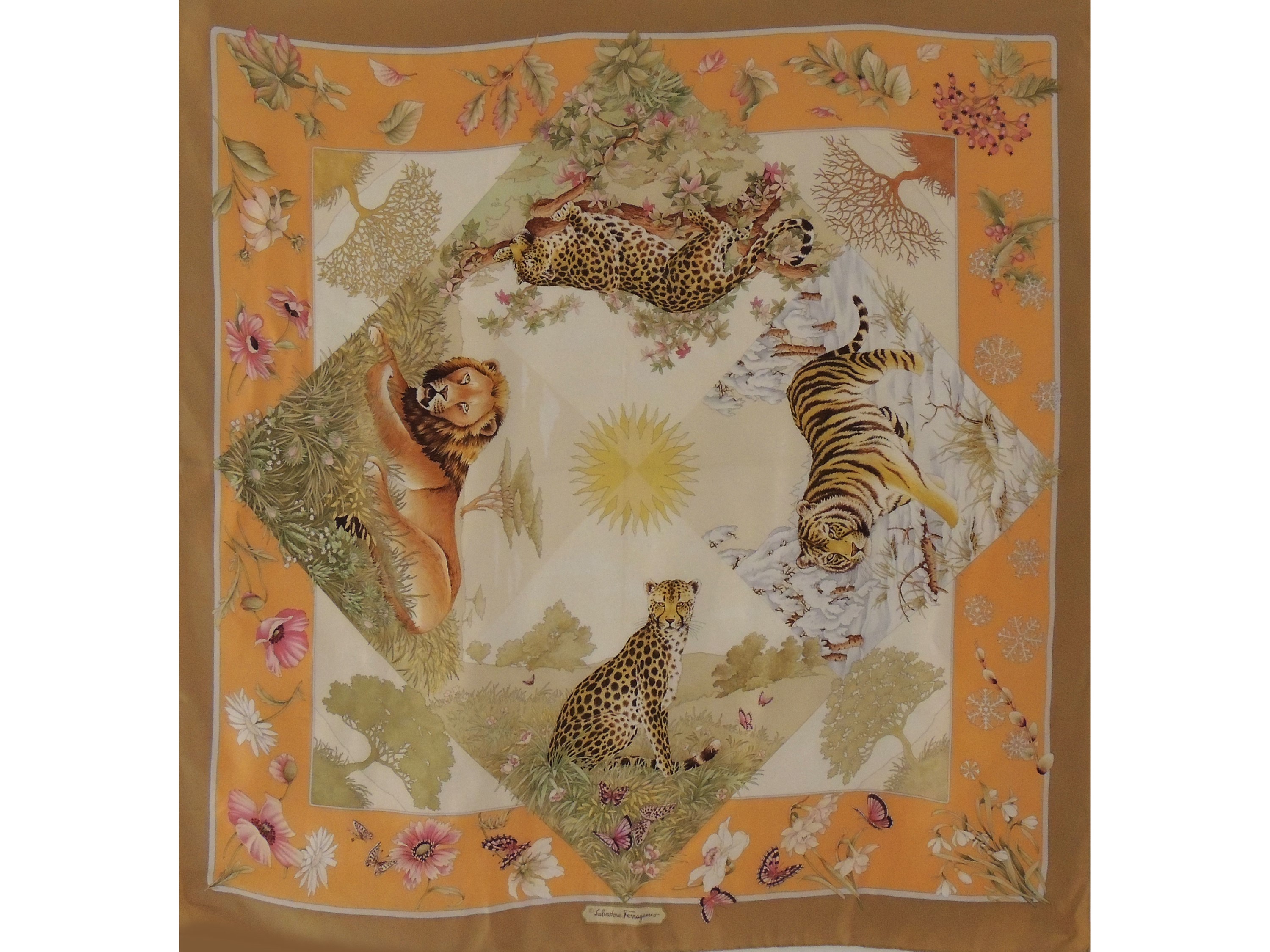Anni Novanta in seta stampata, stampa animalier su fondo avorio, bordo dorato e arancione con foglie e fiori, lievi difetti