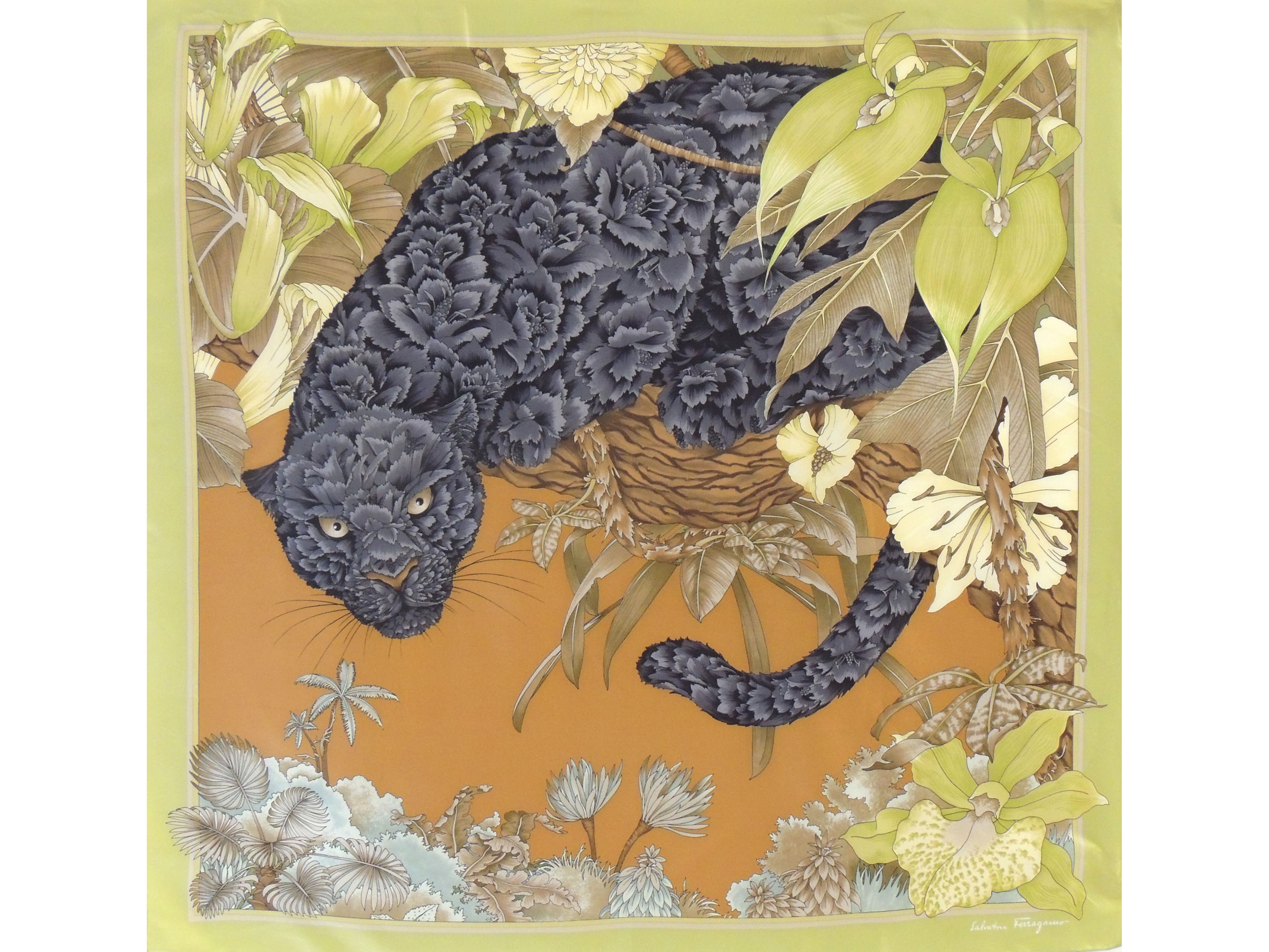 Anni Novanta in seta stampata con motivo floreale ed animalier nei toni del marrone e nero, bordura verde pistacchio, corredato di scatola