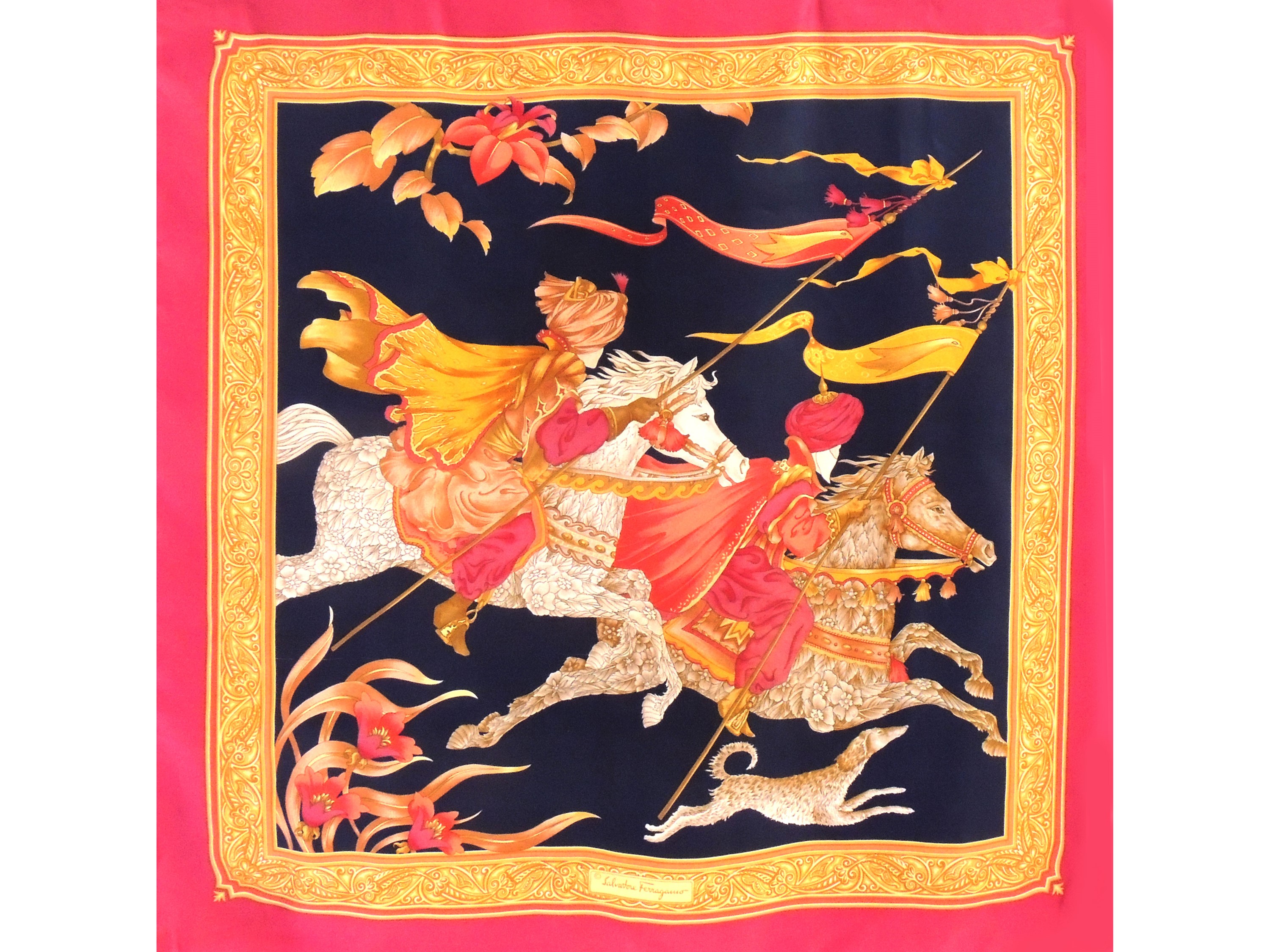 Anni Novanta in seta stampata con cavalieri orientali nei toni del rosso e bordeaux su fondo blu, bordo bordeaux, lievi difetti