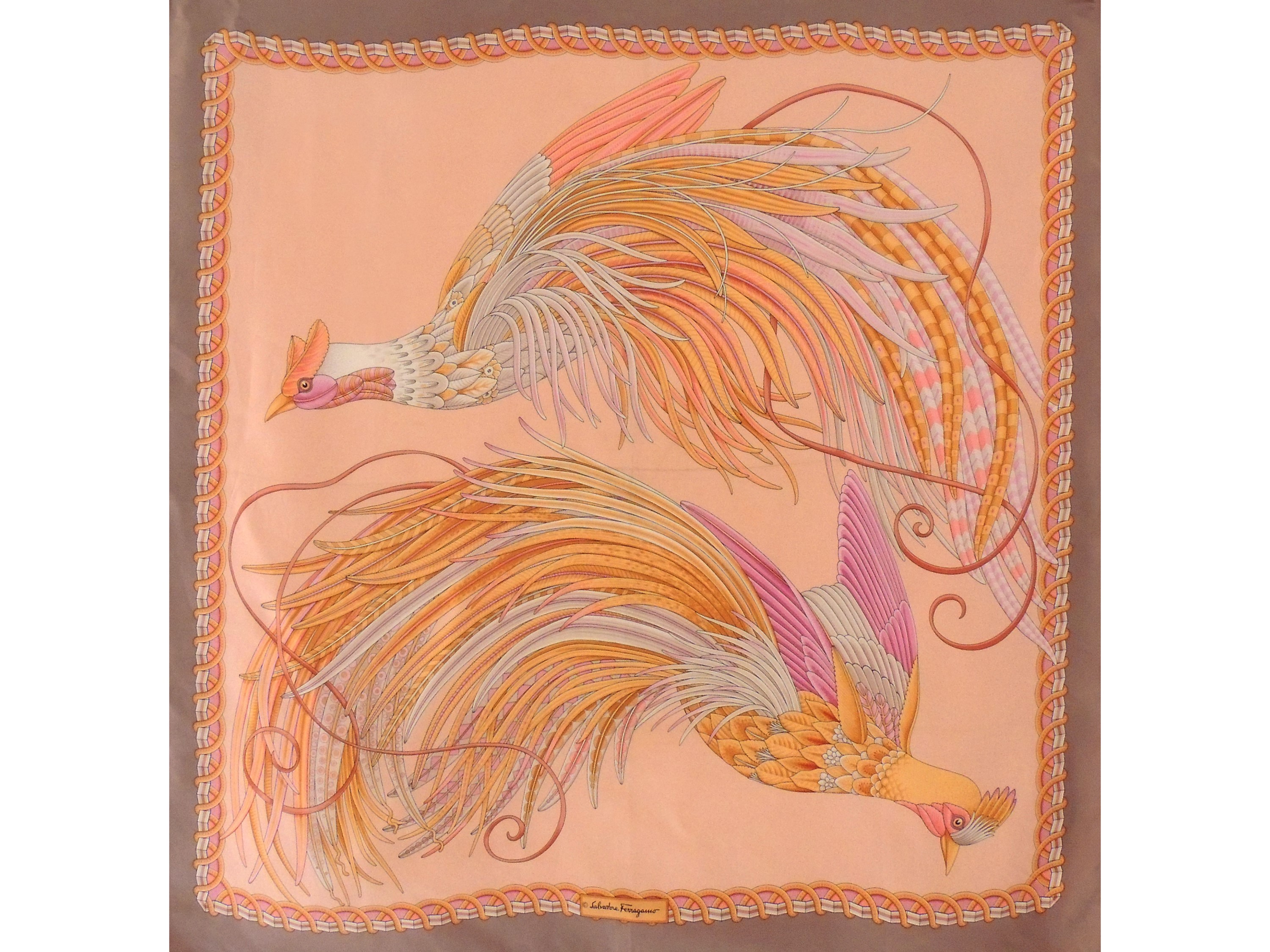 Anni Novanta in seta stampata con due uccelli del Paradiso, nei toni del rosa e dell'arancione sempre su fondo rosa, bordo grigio, lievi difetti
