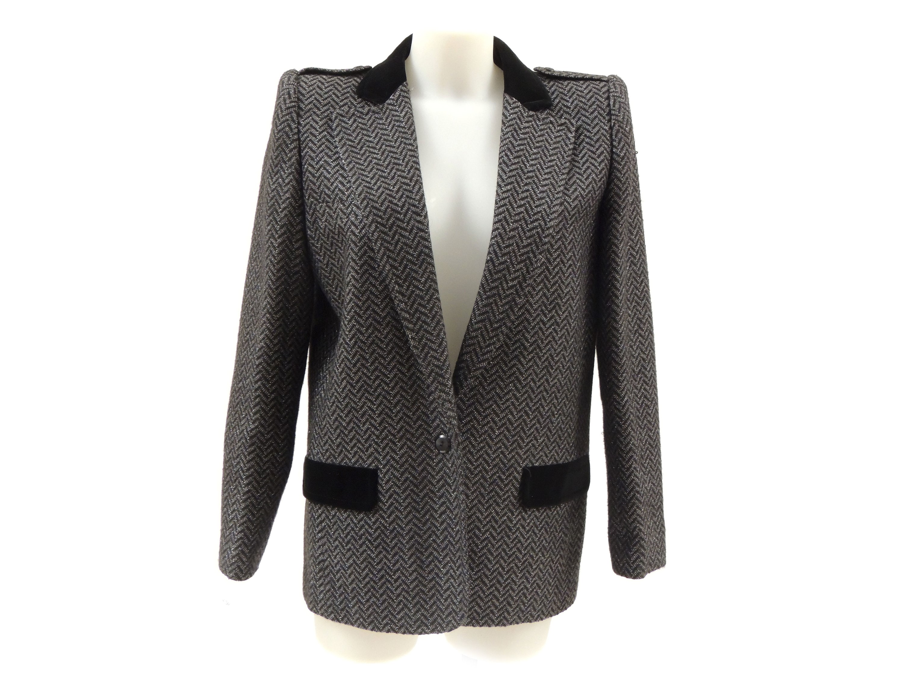 Anni Novanta in lana e lurex spigata nera e grigia, colletto e patte in velluto nero, lievi difetti
