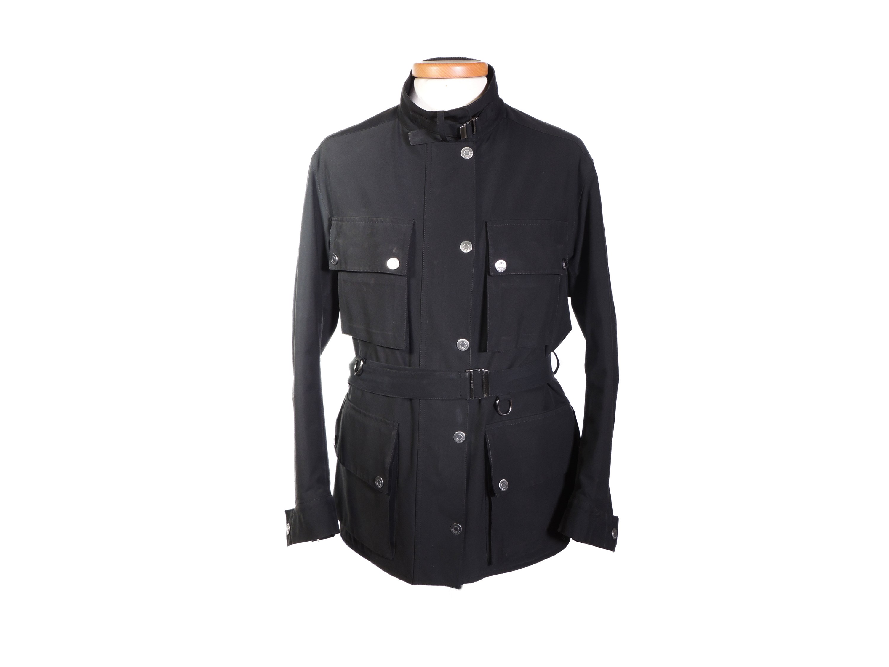Anni Novanta in poliestere nero, con doppie tasche sul fronte, chiusura centrale con zip e bottoni a pressione in metallo argentato, lievi difetti e lievi macchie