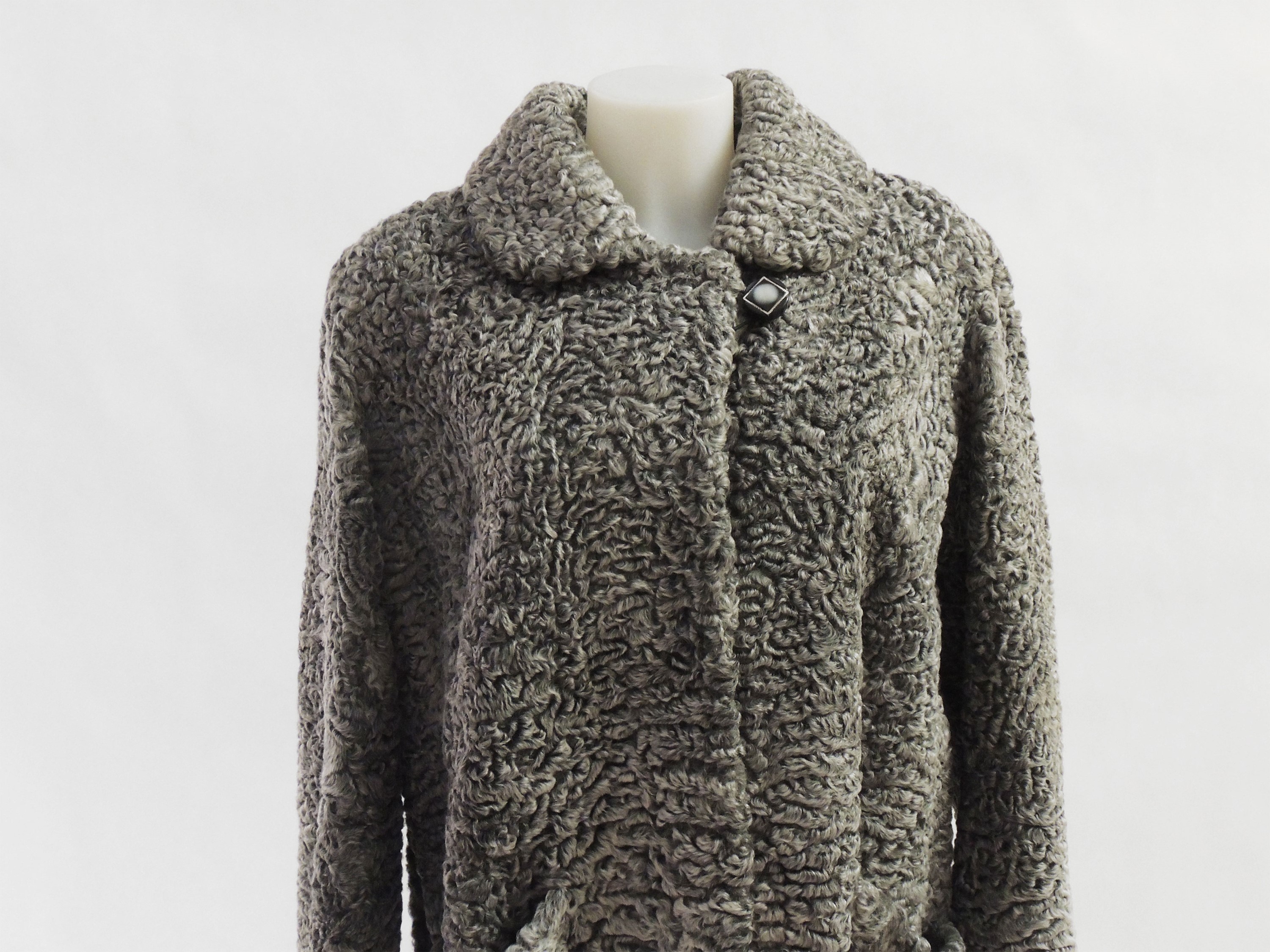 Anni Settanta modello con svasatura, spacchi laterali, chiusura con unico bottone in resina grigia, lievi difetti