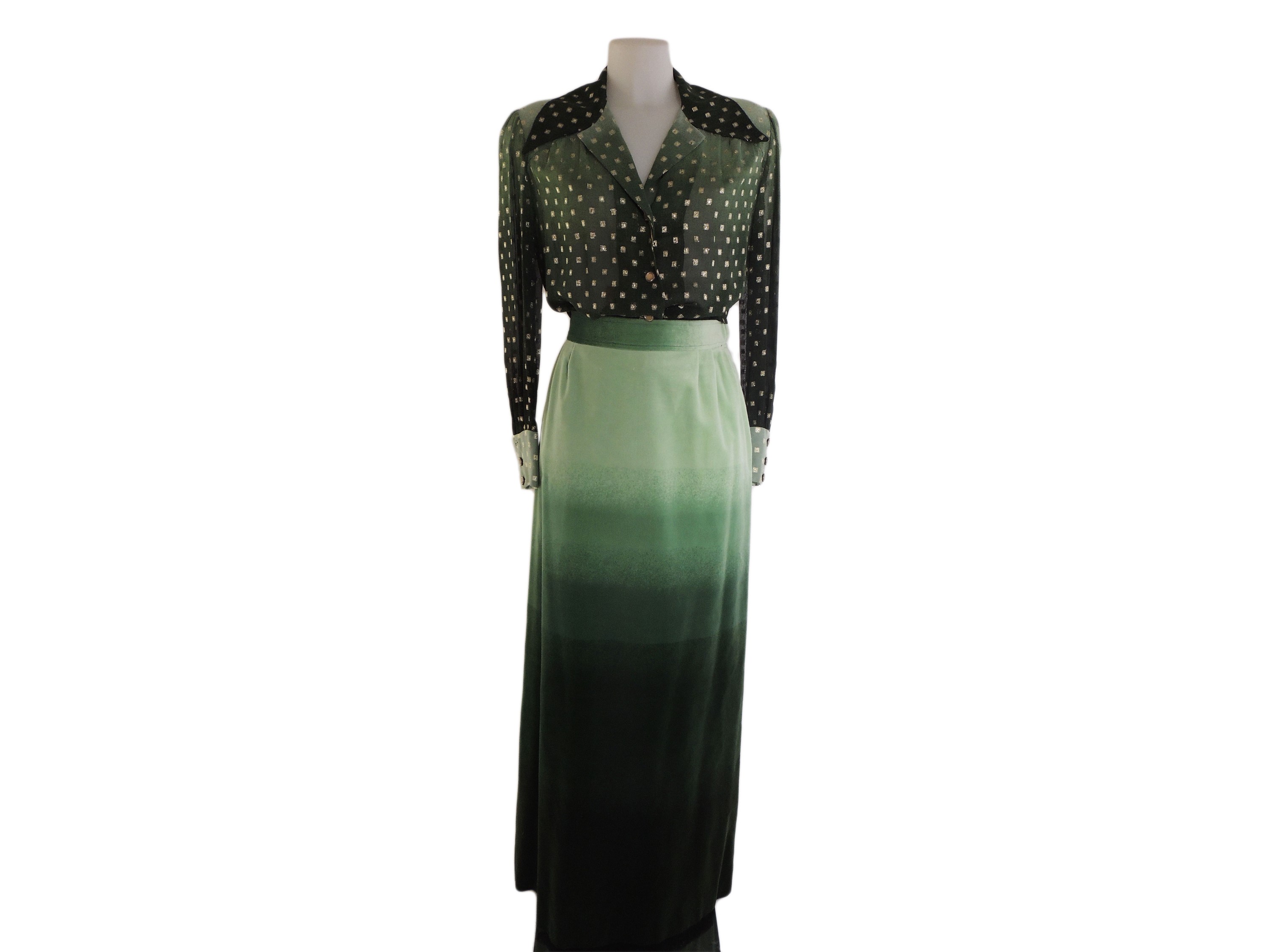 composto da un abito lungo in velluto verde, uno in velluto marrone, una camicia, ed una gonna in velluto verde sfumata, lievi difetti