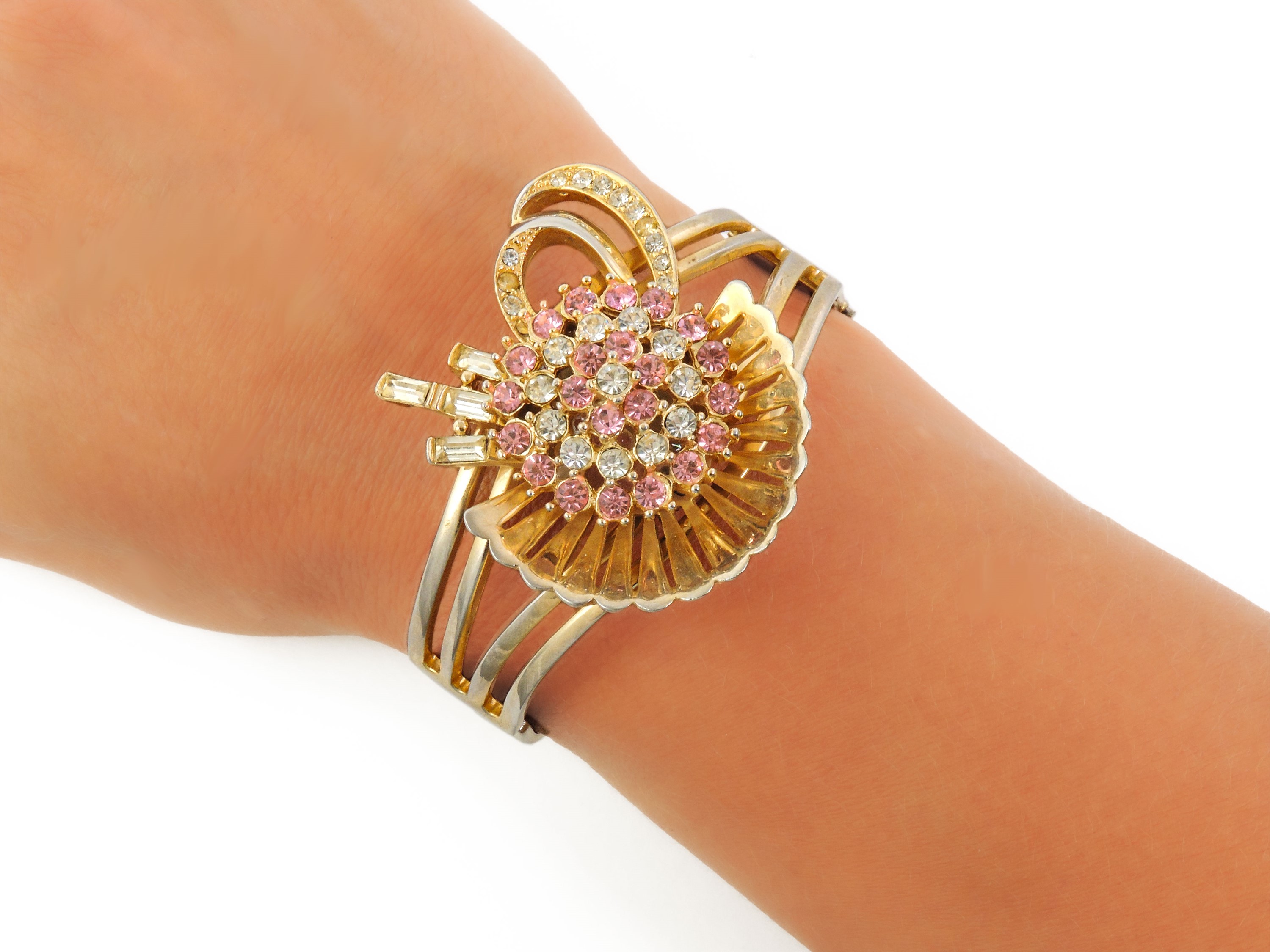 lunghezza cm 38, diam interno bracciale cm 5,5, orecchini h cm 3,5 e lunghezza cm 37 (4) Anni Cinquanta composto da una parure con collana con pendente/spilla, Anthony, orecchini e bracciale rigido ornato da strass rosa e incolore ed un'altra collana con elemento circolare al centro sempre ornato da strass, lievi difetti
