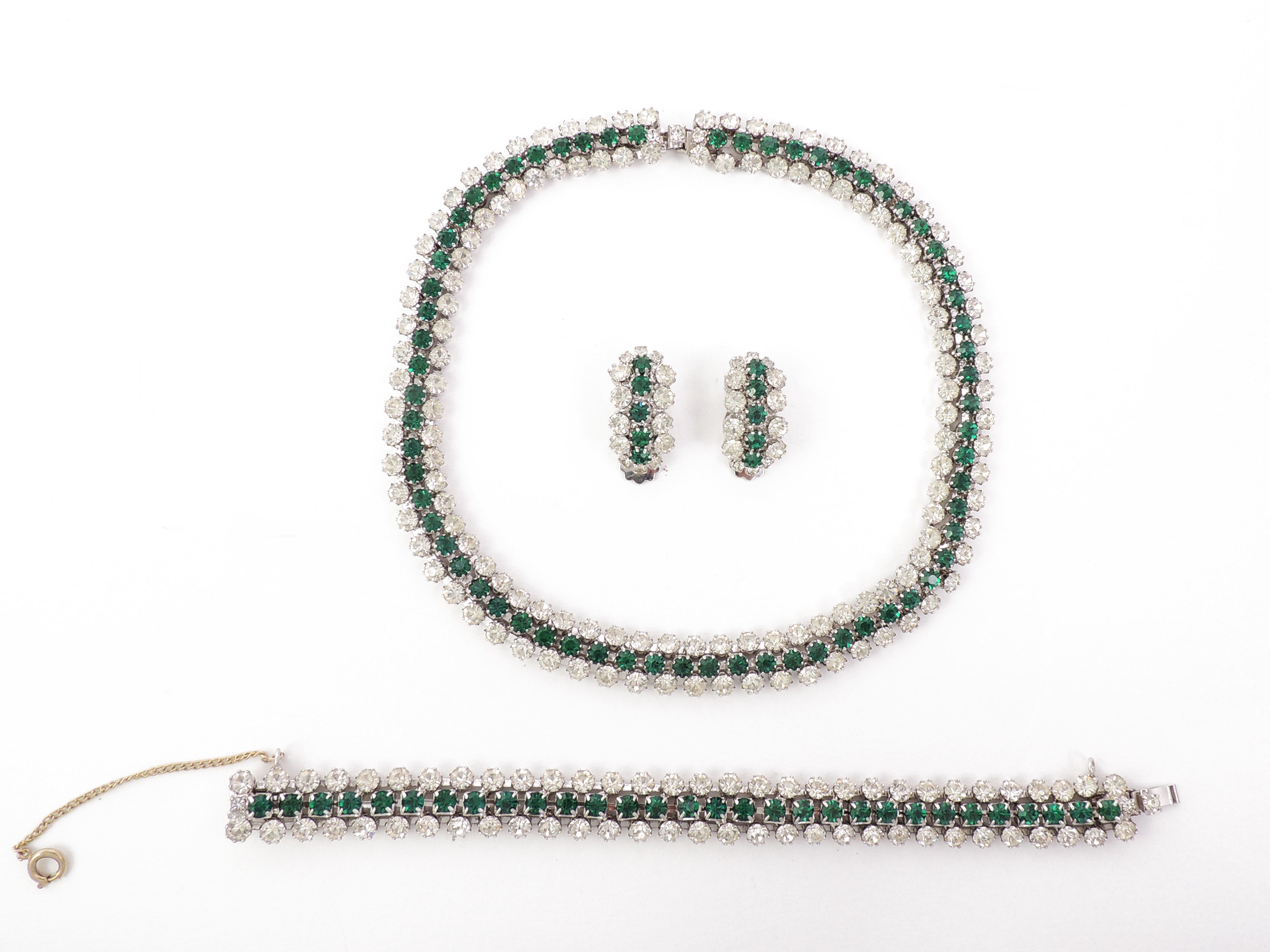 America, Anni Sessanta composta da collana, bracciale e orecchini con strass incolore e verdi simulanti pietre preziose,