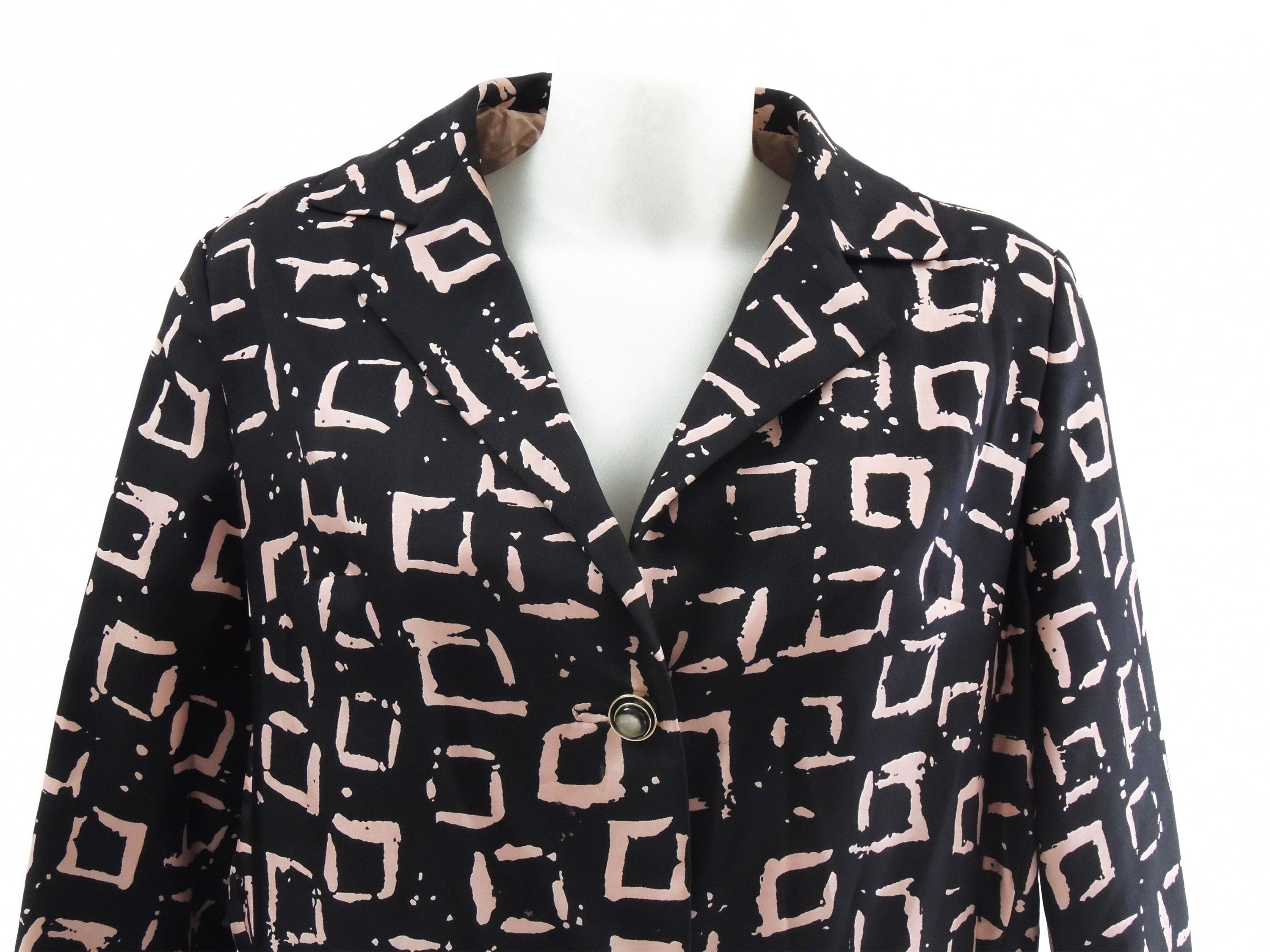 Anni Sessanta in seta nera con motivi astratti rosa, modello a trapezio, chiusura monopetto con bottoni gioiello, lievi difetti