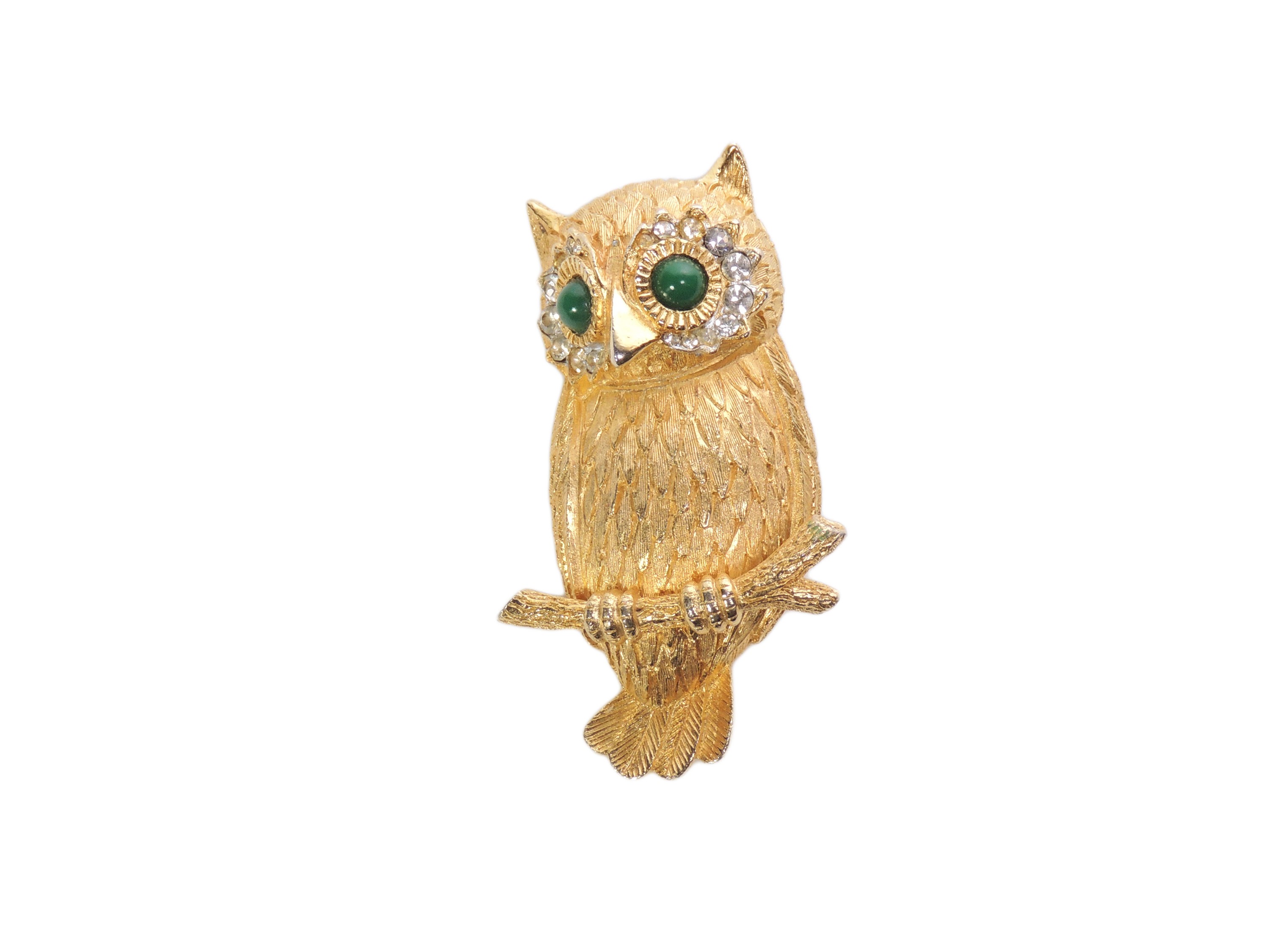 America, Anni Sessanta a forma di gufo, in metallo dorato e strass, occhi con piccoli cabochon verdi, buone condizioni