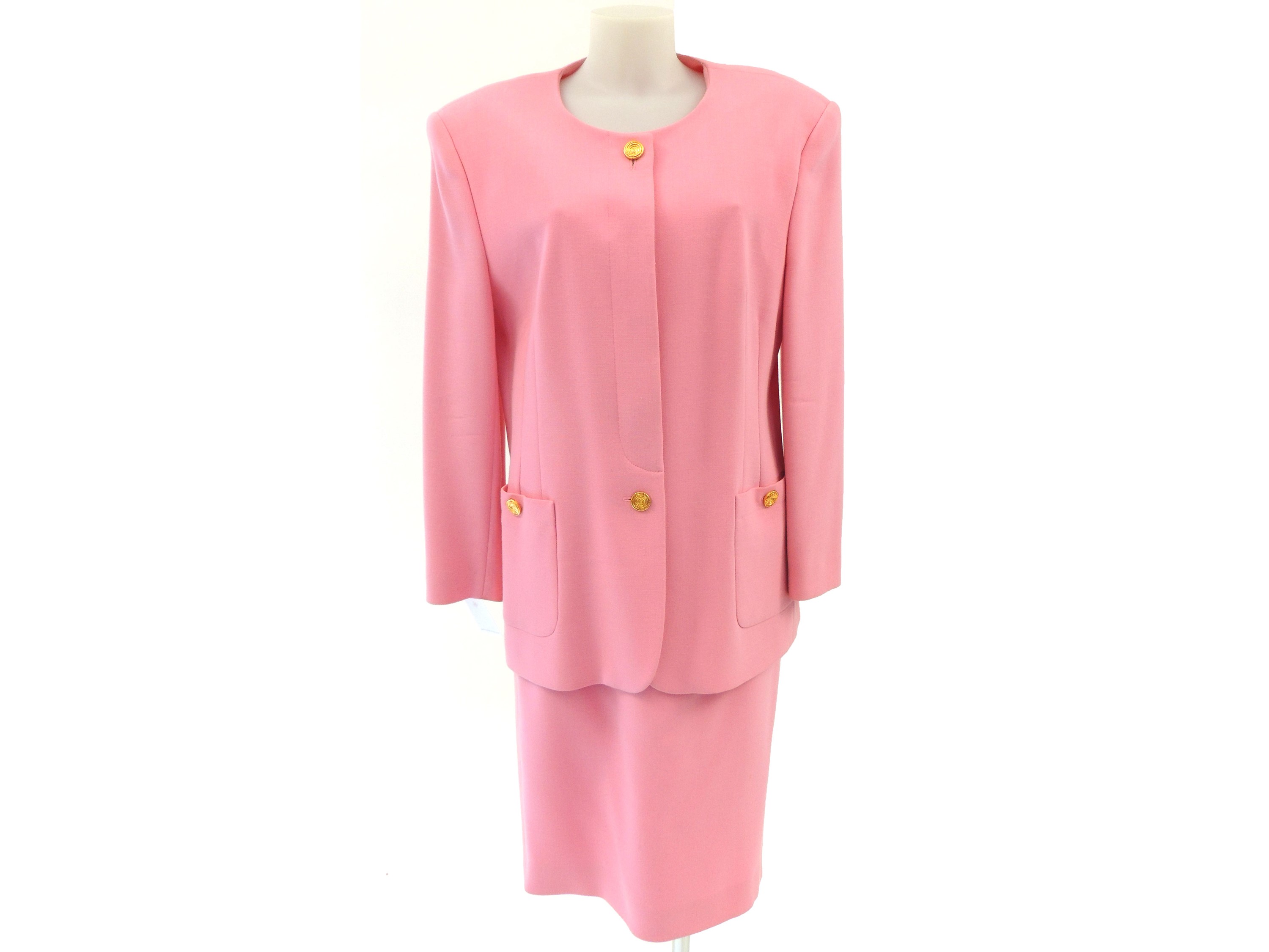 Anni Novanta in lana rosa, composto da giacca con scollo rotondo e chiusura monopetto nascosta con bottoni in metallo dorato. e gonna, lievi difetti