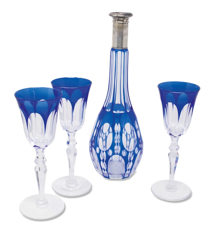 Dodici calici e bottiglia in doppio cristallo incolore e blu