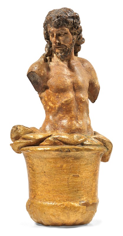 Scultura in legno policromo, cimasa, cm. 35 h.