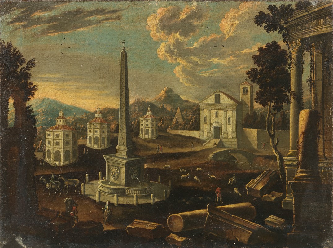 Veduta ideale di città con obelisco, piramide e rovine archeologiche
