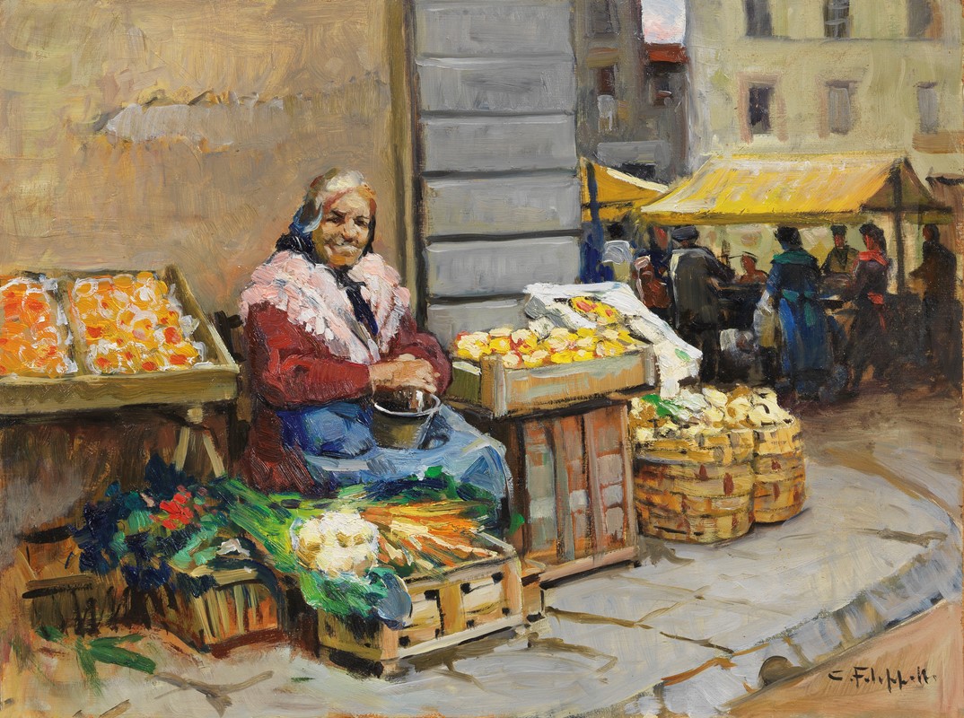 Firma in basso a destra: C Filippelli; titolo e firma al verso: La fruttivendola / Cafiero Filippelli.