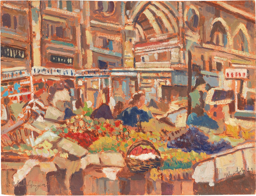 Olio su cartone, cm. 25,5x33,5 1929 Firma e data in basso a destra: Ulvi Liegi 29; firma in basso a sinistra: Ulvi Liegi; firma e titolo al verso: Luigi Levi Ulvi Liegi / Mercato a Livorno: cartiglio con scritta: Ulvi Liegi / Il mercato a Livorno / n. catalogo 21.