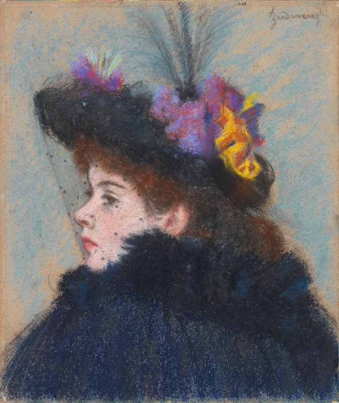 Pastelli su cartone, cm. 46x38 Firma in alto a destra: Zandomeneghi. Al verso: etichetta Durand-Ruel / Paris / New York, con n. 2962 e titolo Tête de femme.