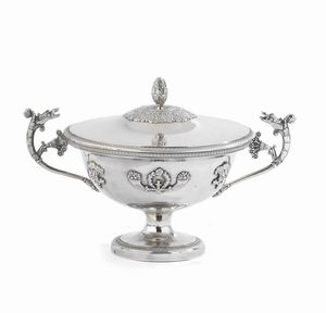ZUCCHERIERA, PARIGI, 1830 CIRCA in argento, piede circolare su cui poggia la coppa decorata da mascheroni e cornucopie [..]