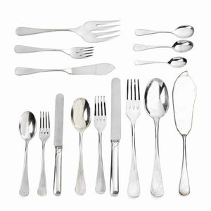 SERVITO DI POSATE, ALESSANDRIA, SECOLO XX, ARGENTIERE CESA in argento con manici dai finali arrotondati, composto [..]
