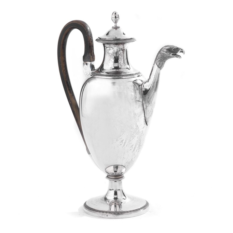 in argento, base circolare con profilo a palmette, corpo ovoidale, beccuccio con finale a testa d'aquila, presa in legno a voluta e finale del coperchio a pigna, alt. cm 30,5, g 1100