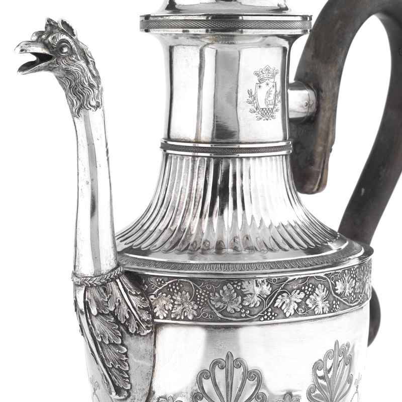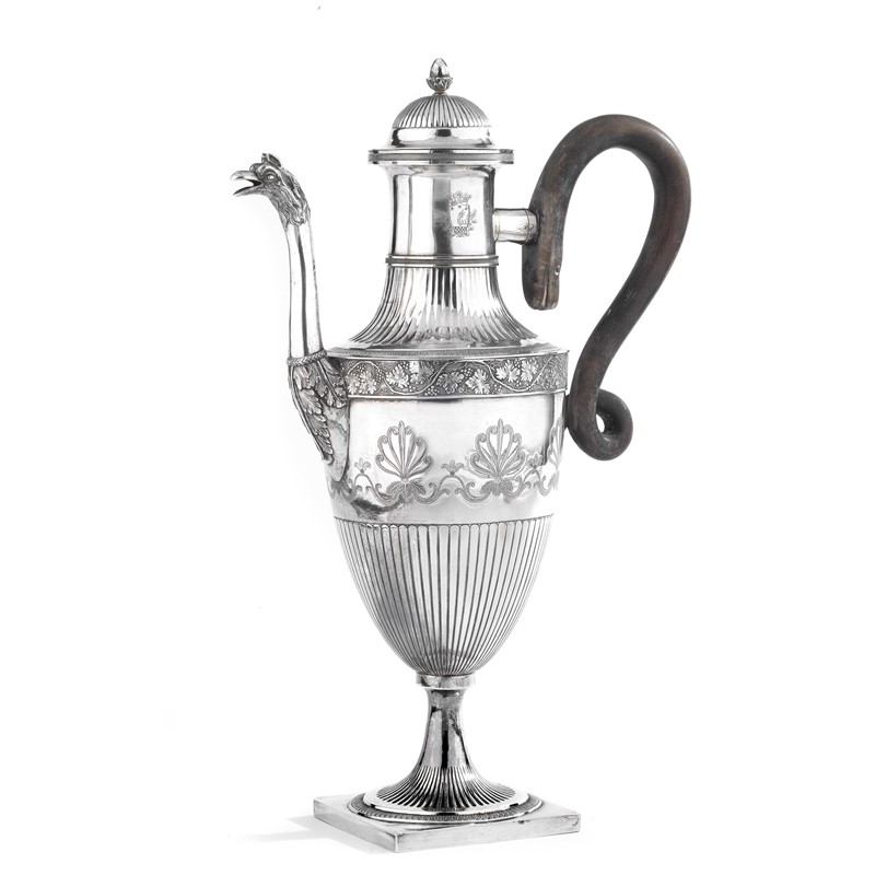 in argento, base quadrata, corpo ovoidale decorato da baccellature, festoni di palmette e tralci di vite, presa in legno in forma di serpente, beccuccio con finale zoomorfo, alt. cm 44, g 1400