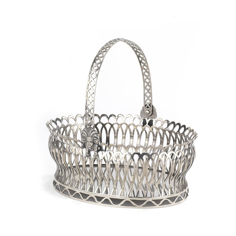 in argento di forma ovale, ampio bordo traforato come il manico, cm 19x14x18, g 360