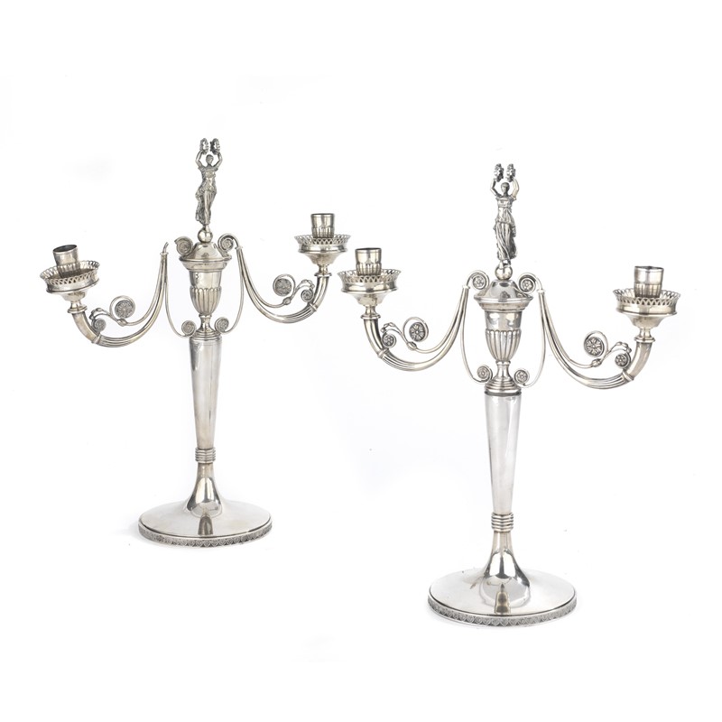 in argento di gusto Impero, basi circolari con fusti rastrmati terminanti a vaso su cui si trova figura femminile in abiti classici, due bracci a volute, alt. cm 38, complessivi g 1695