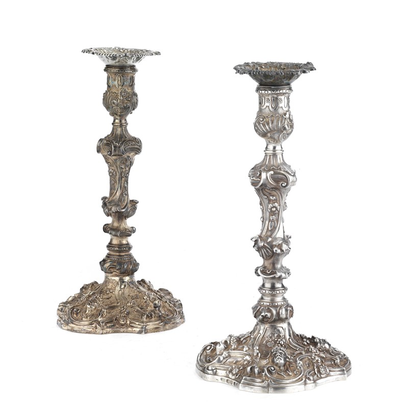 in argento, basi polilobate riccamente sbalzate a volute, mascheroni e boccioli di fiori, fusti a balaustro, alt. cm 31, complessivi g 2360