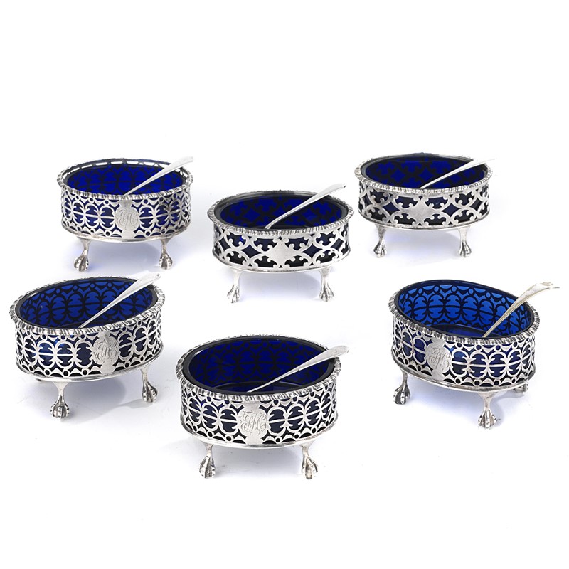 in argento di forma ovale con alto bordo traforato e piedini ad artigli su sfera, interni in vetro blu complete di sei cucchiaini non pertinenti, cm 8,5x6,5; cm 8x6, complessivi g 365