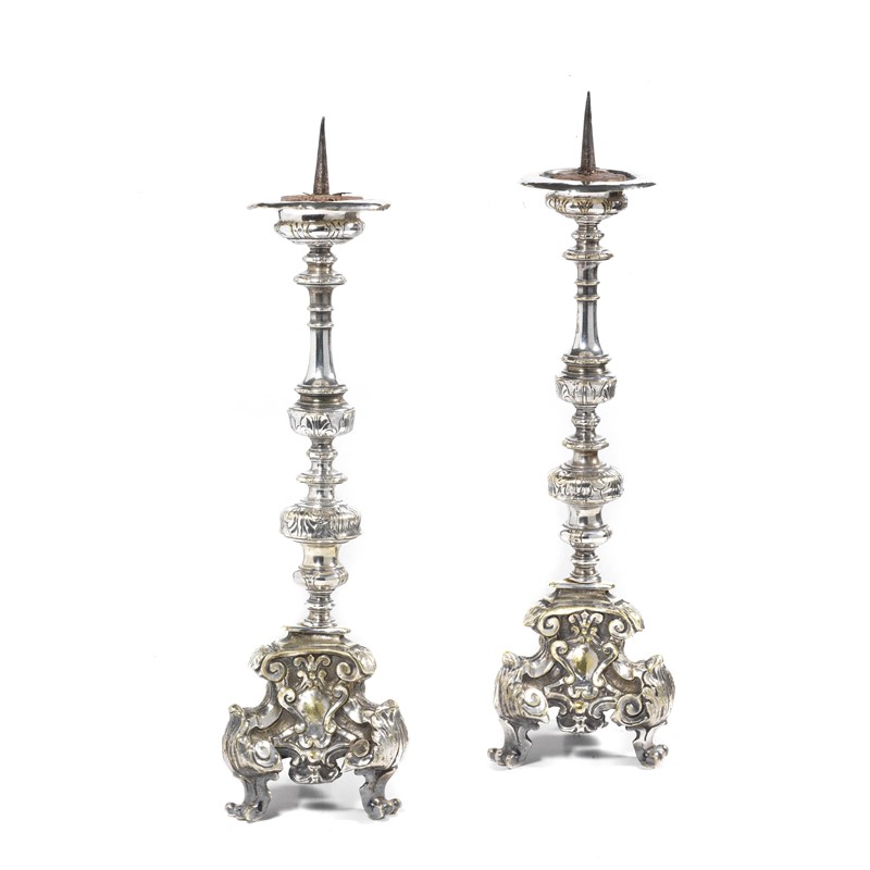 in metallo argentato con portacandela a coppa, basi tripodi decorate da riserve e foglie, fusti a balaustro con nodo piriforme, alt. cm 48