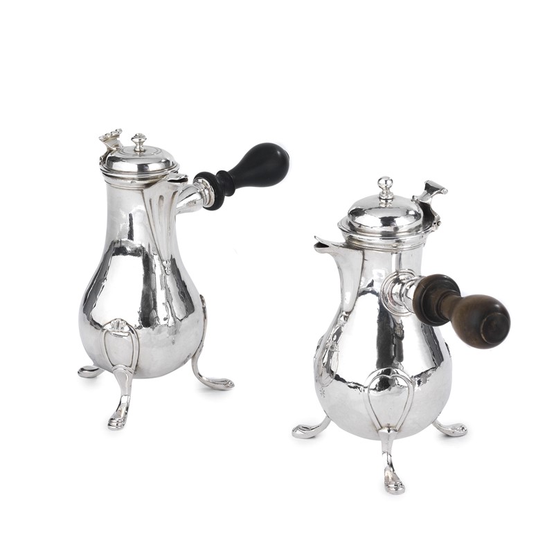 in argento, ciascuno poggiante su tre alti piedini terminanti a zoccolo equino, prese dritte e finali dei coperchi uno a sfera e uno a trottola, alt. cm 12,5 e cm 13, complòessivi g 390