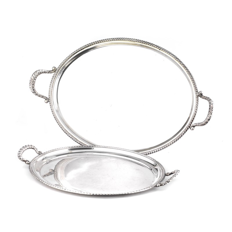 in argento di forma ovale con bordo e anse a cordonetto, cm 50x32 e cm 62x37, complessivi g 2885