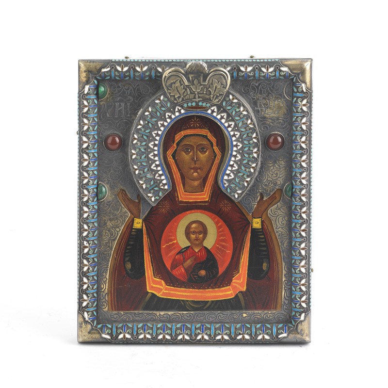 raffigurante Madonna con Bambino, riza in argento, smalti e pietre cabochon, cm 17,5x14