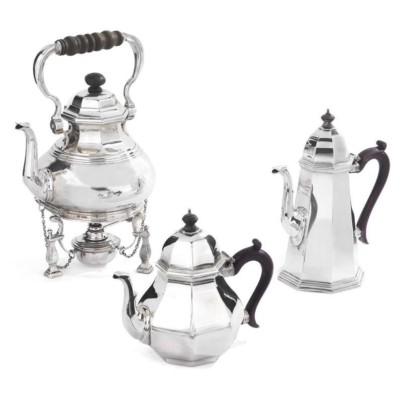 A SILVER SAMOVAR, LONDON, 1929, MARK OF WILLIAM COMYNS & SONS AND TWO SILVER TEA POT, LONDON, 1970, MARK OF JOHN HENRY ODELL
