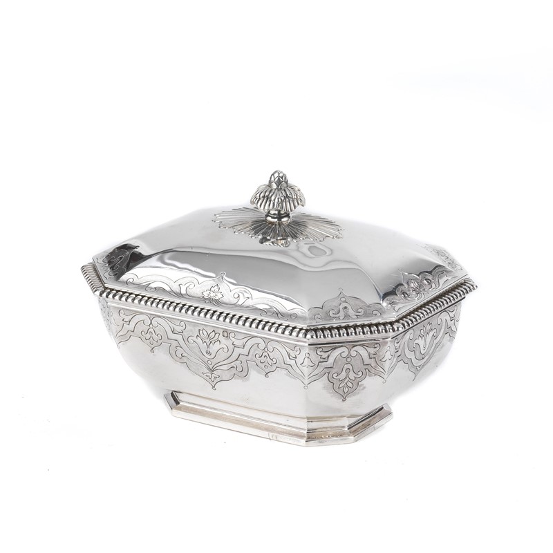 in argento di forma esagonale, decorata da volute, presa del coperchio a pomo, cm 15x11,5x10, g 455
